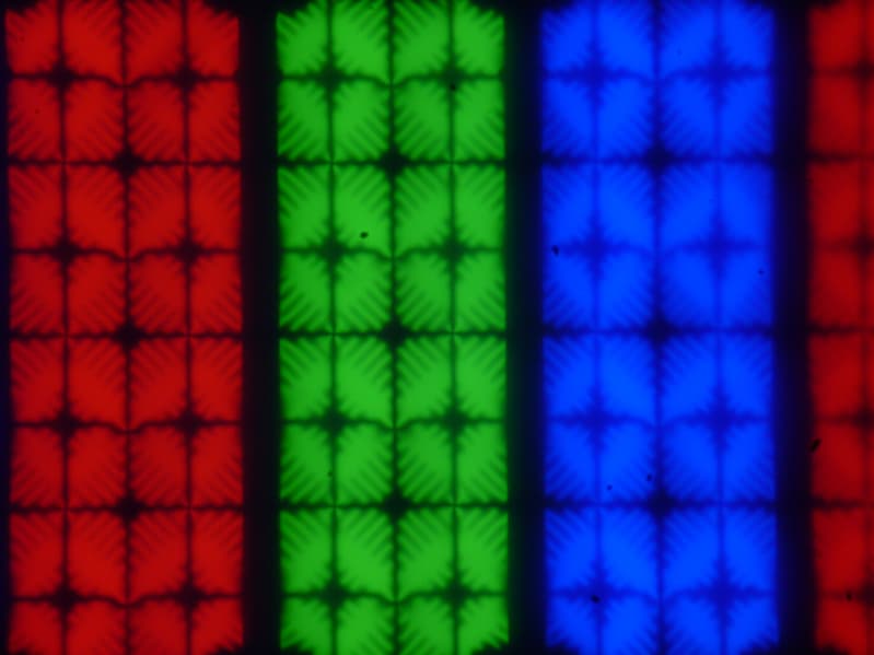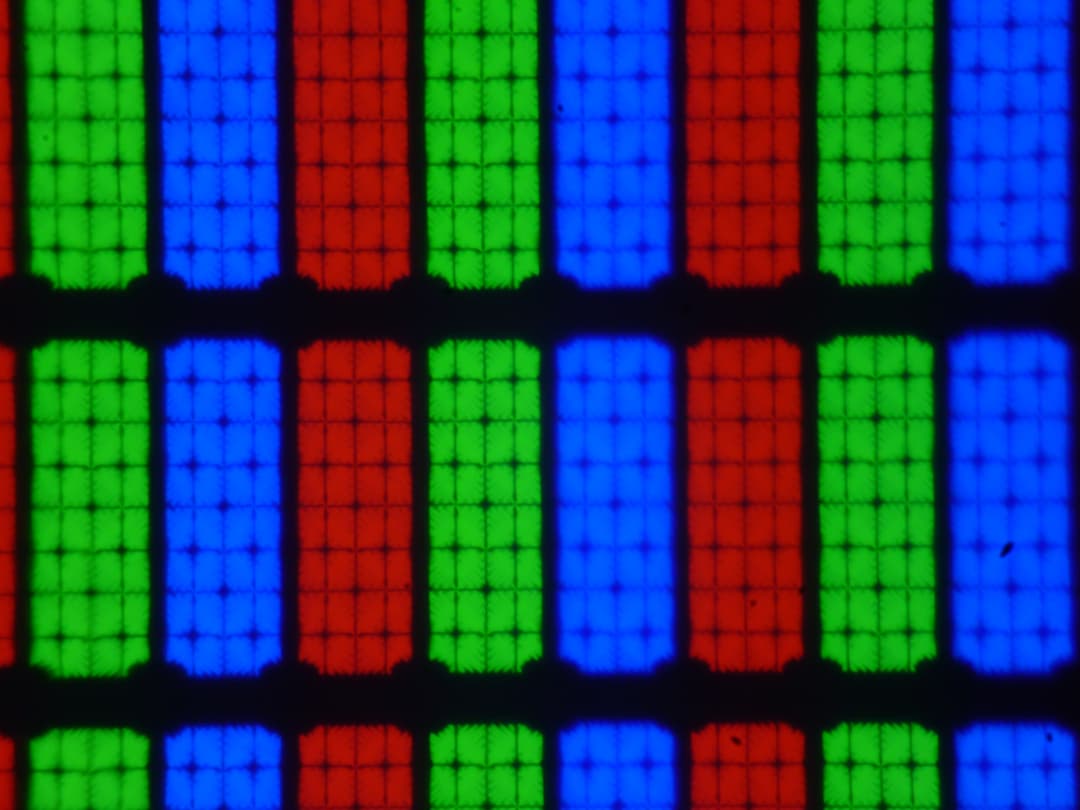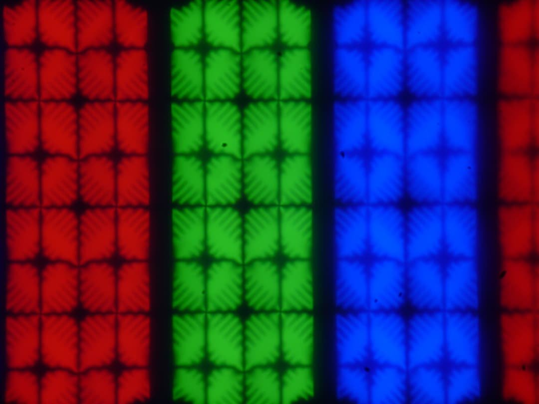 Субпиксели трех цветов (красного, зеленого и синего) поделены на несколько участков с доменами в различающейся ориентации. Такое устройство в принципе способно обеспечить хорошие углы обзора, чему способствует вариация ориентации ЖК в доменах. Отметим, что никакого «кристаллического эффекта» (микроскопической вариации яркости и оттенка) в явном виде нет.