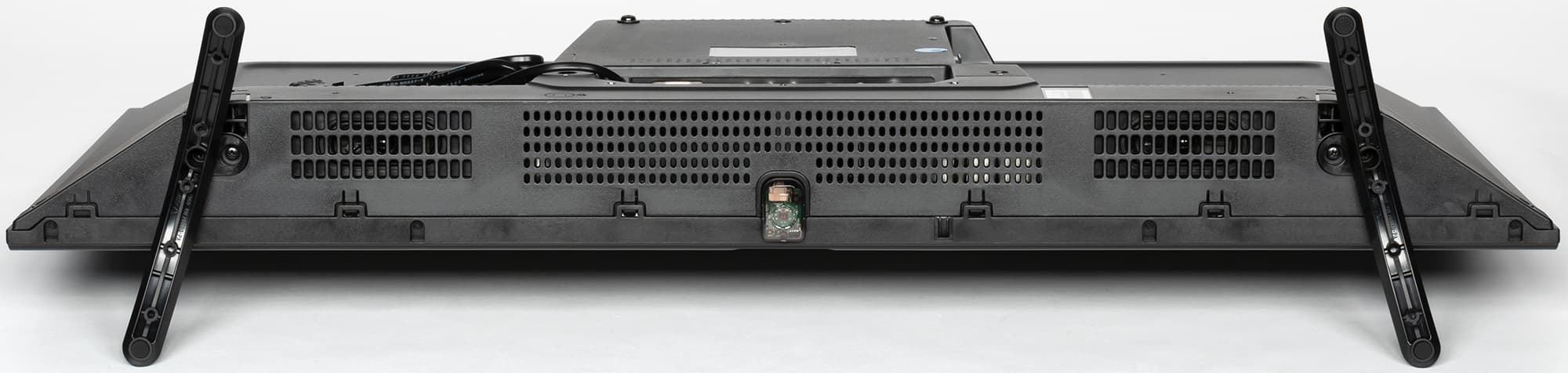 Телевизор имеет полностью пассивное охлаждение. За решетками на нижнем торце расположены встроенные громкоговорители с вытянутыми диффузорами.