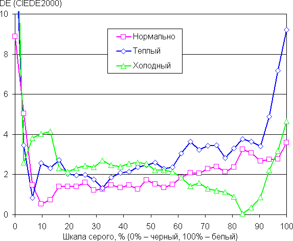 Графики ниже показывают цветовую температуру на различных участках шкалы серого и отклонение от спектра абсолютно черного тела (параметр ΔE) при выборе трех вариантов для настройки Цветовой тон:
