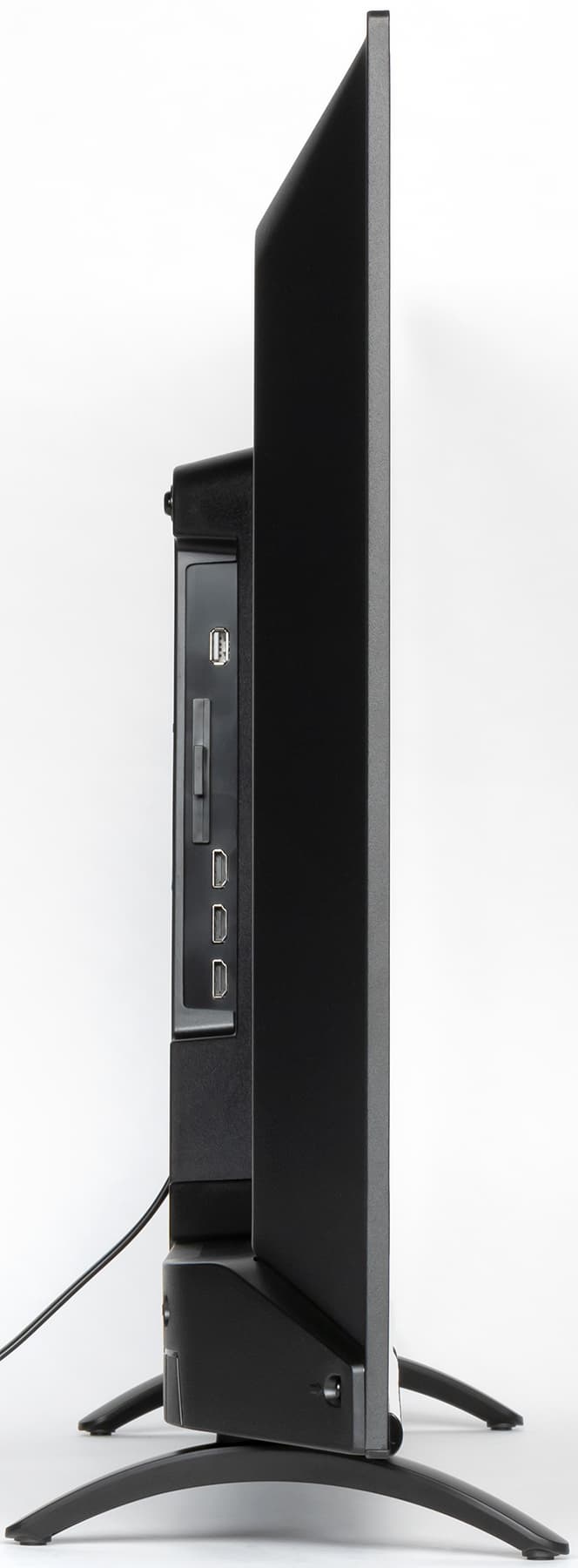 Подставка выполнена в виде двух дугообразных пластмассовых ножек, которые винтами прикрепляются к нижнему торцу. Опираются ножки на резиновые накладки. Расстояние между ножками 75 см. Стоит телевизор устойчиво, жесткость ножек достаточная. Телевизор, установленный на горизонтальную поверхность на штатную подставку, стоит вертикально без видимого наклона. Альтернативный способ установки телевизора — это вариант крепления телевизора на VESA-кронштейне под имеющиеся на задней панели резьбовые отверстия в углах прямоугольника 200 на 300 мм.