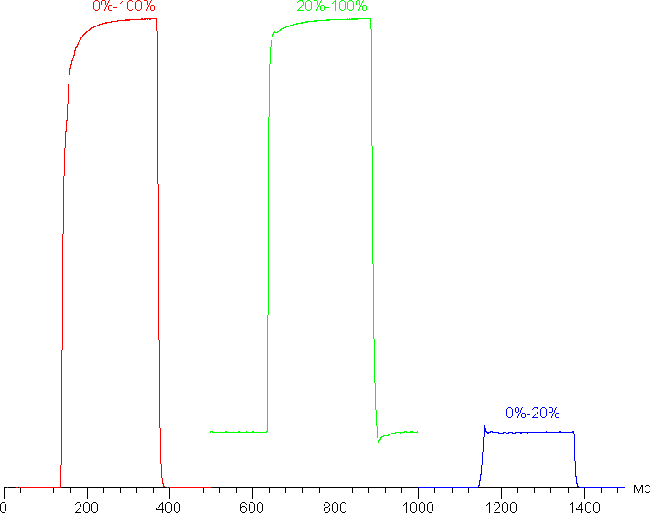 Время отклика при переходе черный-белый-черный равно 30 мс (23 мс вкл. + 7 мс выкл.). Переходы между полутонами происходят в среднем за 16 мс в сумме. Есть очень незначительный «разгон» матрицы, не приводящий к видимым артефактам. Ниже приведены графики для перехода от черного к белому и для двух полутоновых переходов между оттенками 20%—100% и 0%—20% (по вертикали — яркость, по горизонтали — время):