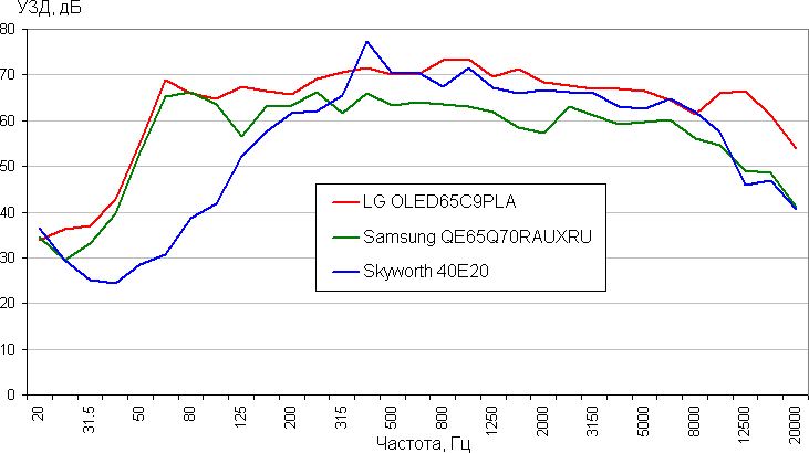 Сравним АЧХ акустики этого ТВ с АЧХ двух телевизоров высшего класса (замер при воспроизведении розового шума на расстоянии 2 м от центра экрана):