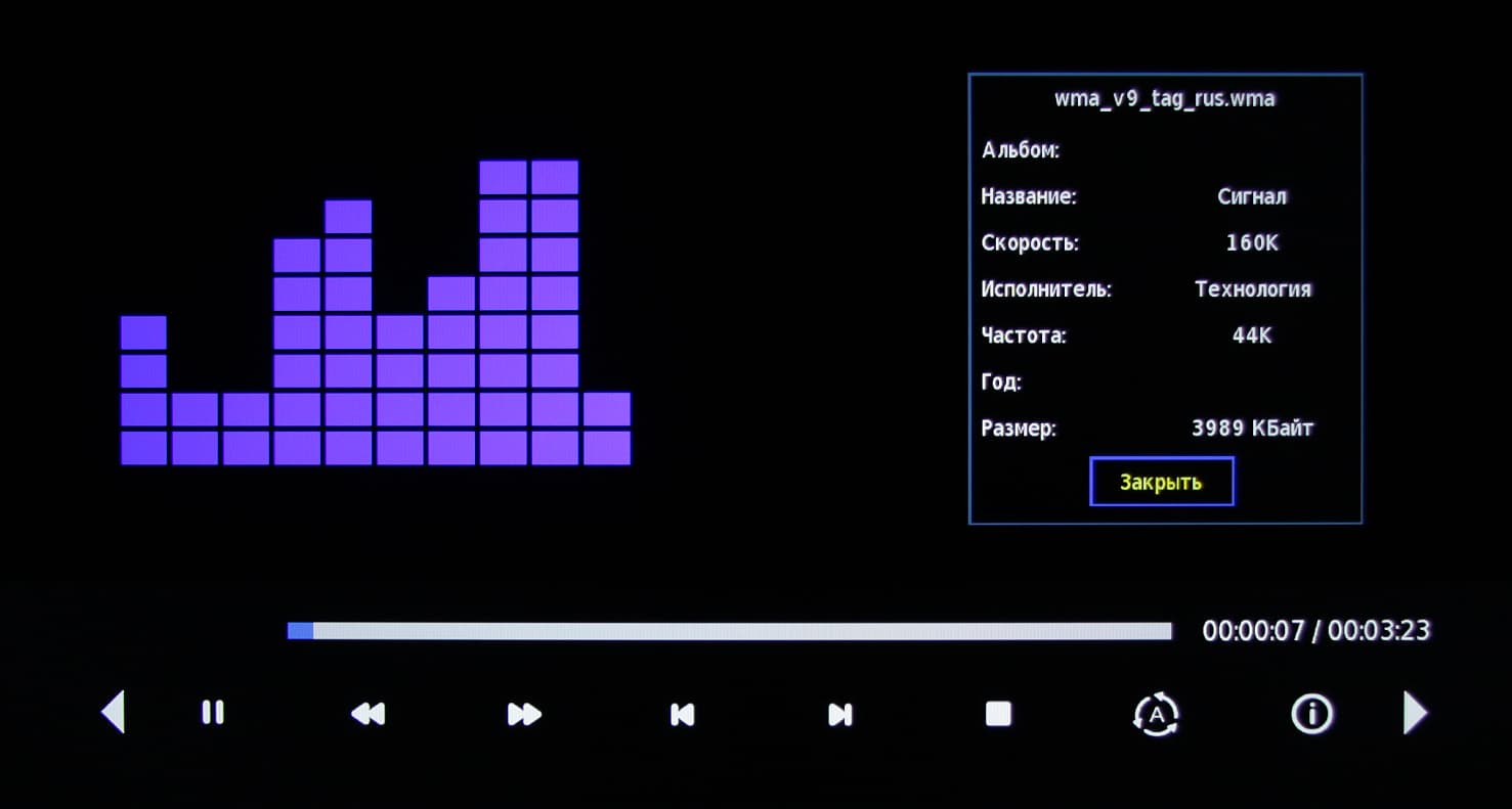 В случае аудиофайлов поддерживаются множество распространенных и не очень форматов, как минимум AAC, MP3, OGG, WMA (и с 24 бит), M4A, WAV, AC3 и FLAC (расширение может быть FLAC или FLA). Поддерживаются тэги как минимум в MP3, OGG и WMA (русские должны быть в Unicode).