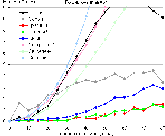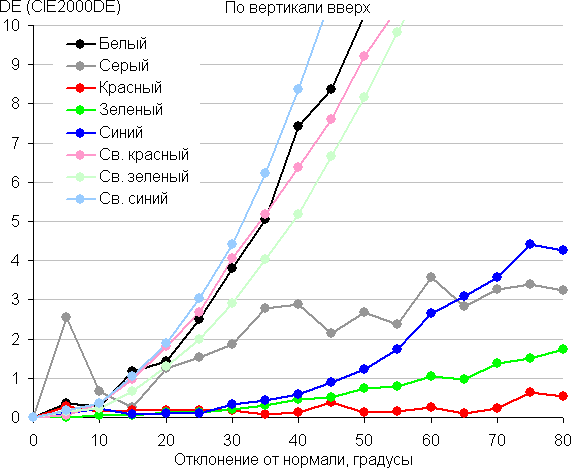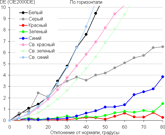 Для количественной характеристики изменения цветопередачи мы провели колориметрические измерения для белого, серого (127, 127, 127), красного, зеленого и синего, а также светло-красного, светло-зеленого и светло-синего полей во весь экран с использованием установки, подобной той, что применялась в предыдущем тесте. Измерения проводились в диапазоне углов от 0° (датчик направлен перпендикулярно к экрану) до 80° с шагом в 5°. Полученные значения интенсивностей были пересчитаны в отклонение ΔE относительно замера каждого поля при перпендикулярном положении датчика относительно экрана. Результаты представлены ниже: