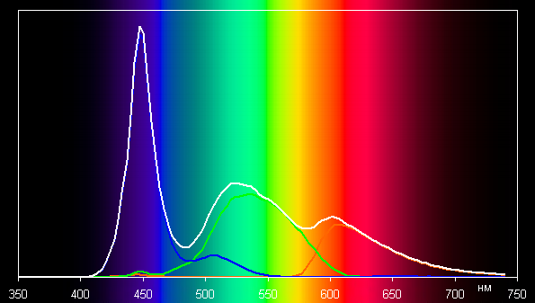 Такой спектр с узким пиком синего и с широкими горбами зеленого и красного цветов характерен для телевизоров/мониторов, в которых используется белая светодиодная подсветка с синим излучателем и желтым люминофором.