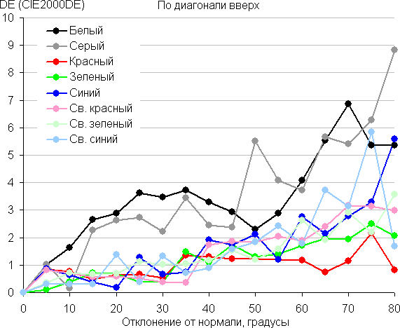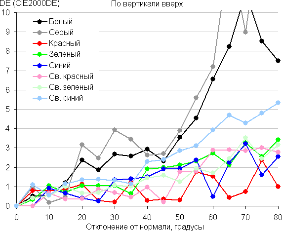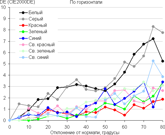 Для количественной характеристики изменения цветопередачи мы провели колориметрические измерения для белого, серого (127, 127, 127), красного, зеленого и синего, а также светло-красного, светло-зеленого и светло-синего полей во весь экран с использованием установки, подобной той, что применялась в предыдущем тесте. Измерения проводились в диапазоне углов от 0° (датчик направлен перпендикулярно к экрану) до 80° с шагом в 5°. Полученные значения интенсивностей были пересчитаны в отклонение ΔE относительно замера каждого поля при перпендикулярном положении датчика относительно экрана. Результаты представлены ниже: