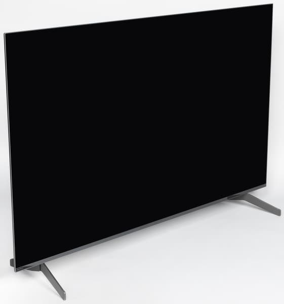 Штатная подставка — это две угловые ножки, изготовленные из стали, и имеющие стойкое черное полуматовое покрытие. Ножки состоят из двух деталей — основания и короткой стойки, полностью утапливаемой внутрь блока экрана. Стойку на основании можно закрепить в двух положениях. В первом, стандартном, основание будет опираться на поверхность стола/тумбы плоскостью, и высота телевизора будет минимальной. Вот как это выглядит на официальном изображении: