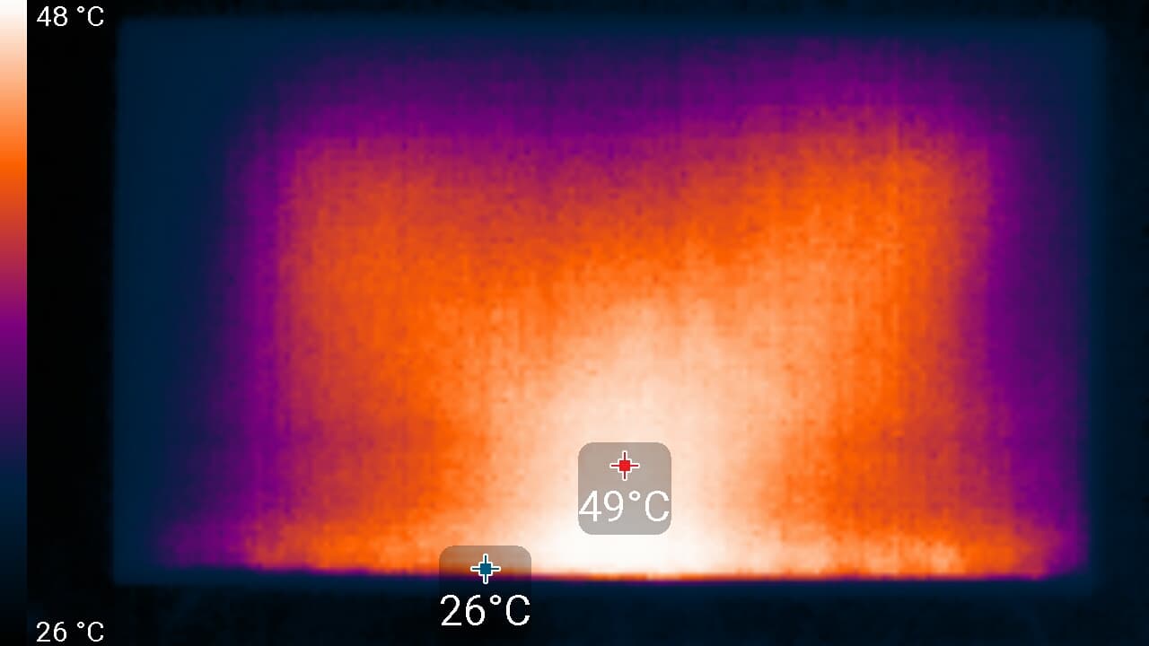 Нагрев телевизора можно оценить по приведенному изображению с ИК-камеры, полученному после долговременной работы на максимальной яркости при выводе белого поля во весь экран и розового шума на максимальной громкости в помещении с температурой примерно 24 °C: