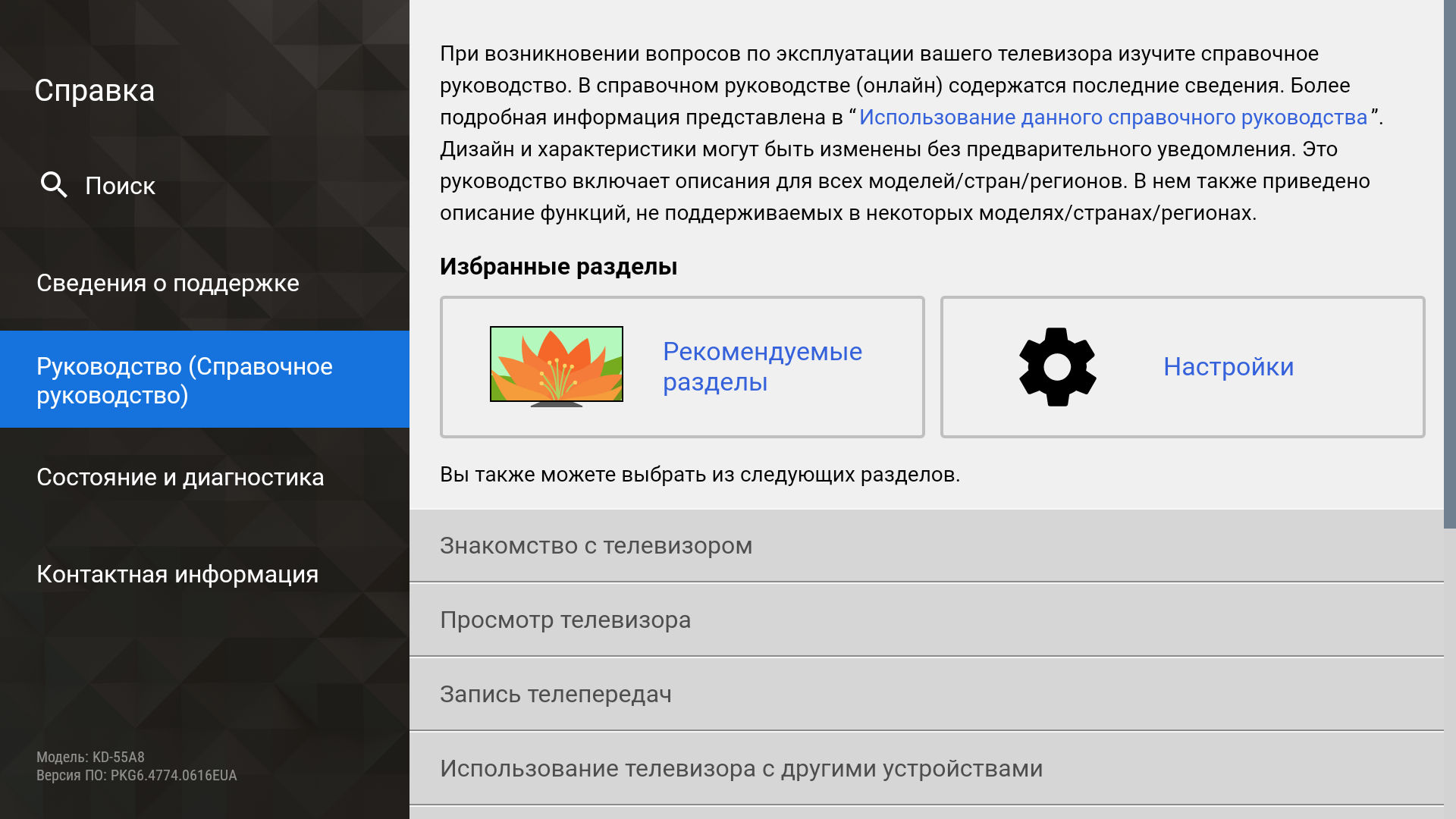 В телевизор встроена довольно подробная справочная система, жалко, что она не контекстнозависимая.