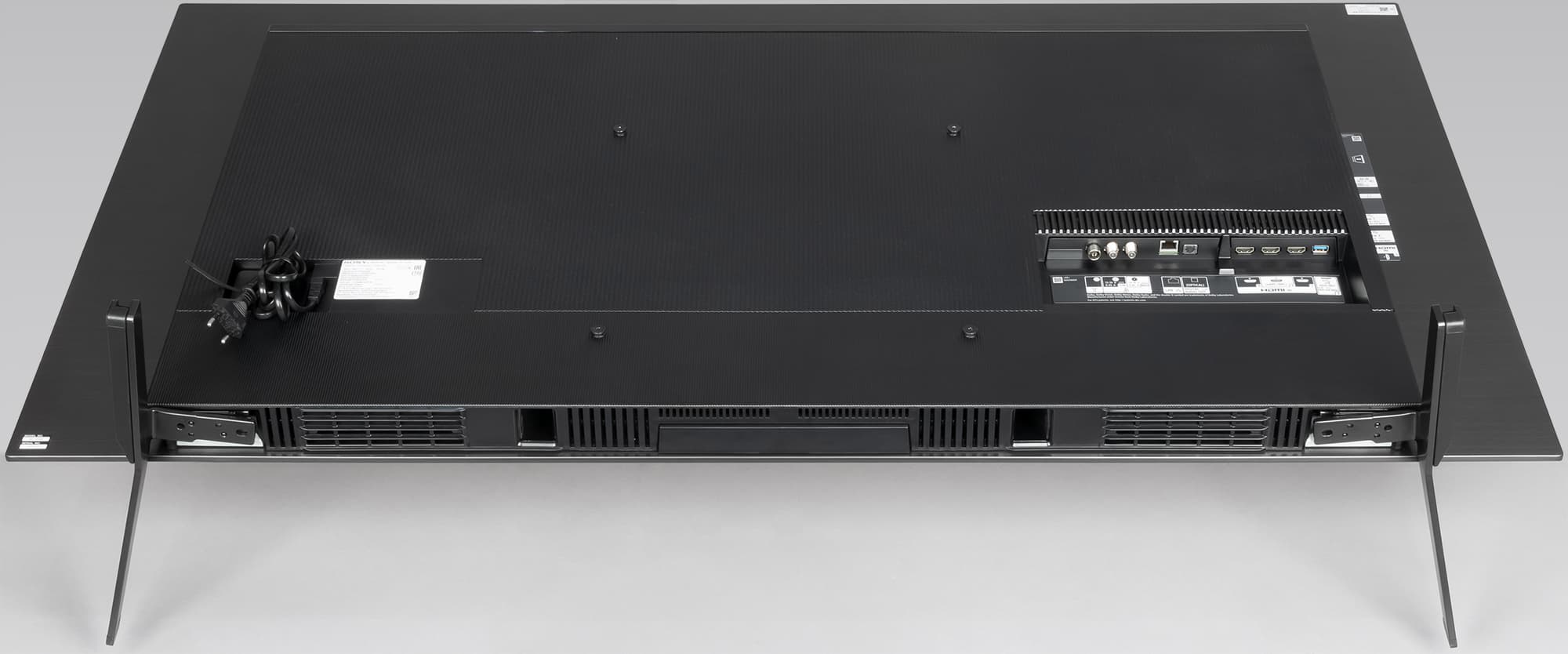 Телевизор оснащен системой Acoustic Surface. Ее суть заключается в том, что приводы, размещенные за экраном, воздействуют непосредственно на панель экрана, заставляя ее излучать звук. В итоге пользователь слышит звук, исходящий непосредственно от экрана, а не с боку или снизу. Данное обстоятельство значительно повышает реалистичность того, что происходит на экране. Вибрация панели в области приводов хорошо чувствуется руками. У такой системы воспроизведения звука есть свои ограничения: во-первых, есть сложности с передачей низких частот, во-вторых, ограниченная поверхность экрана может приводить к возникновению нежелательных резонансов. Первое исправляет низкочастотный громкоговоритель, размещенный сзади по центру, а второе, возможно, отчасти компенсируется частотной коррекцией сигнала.