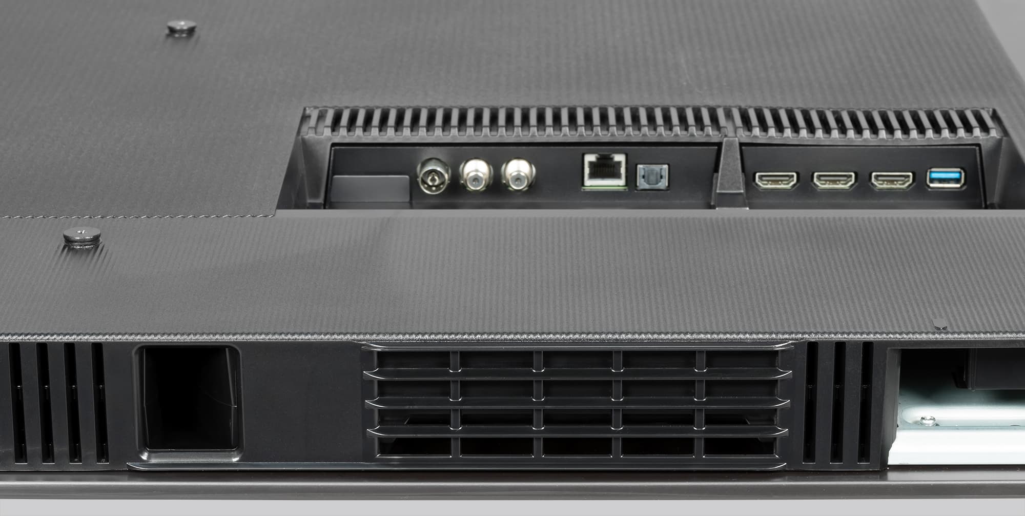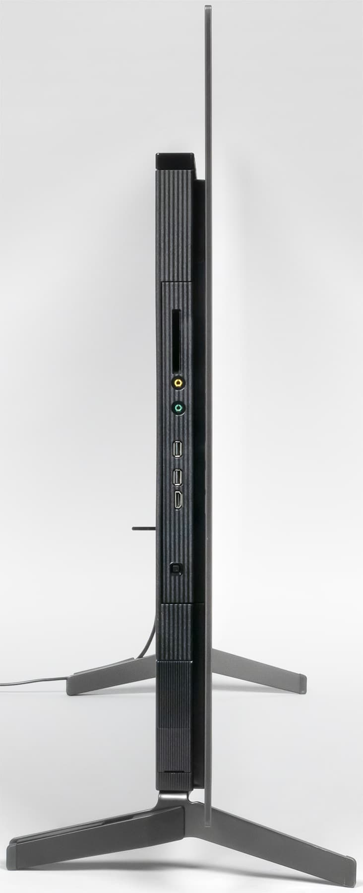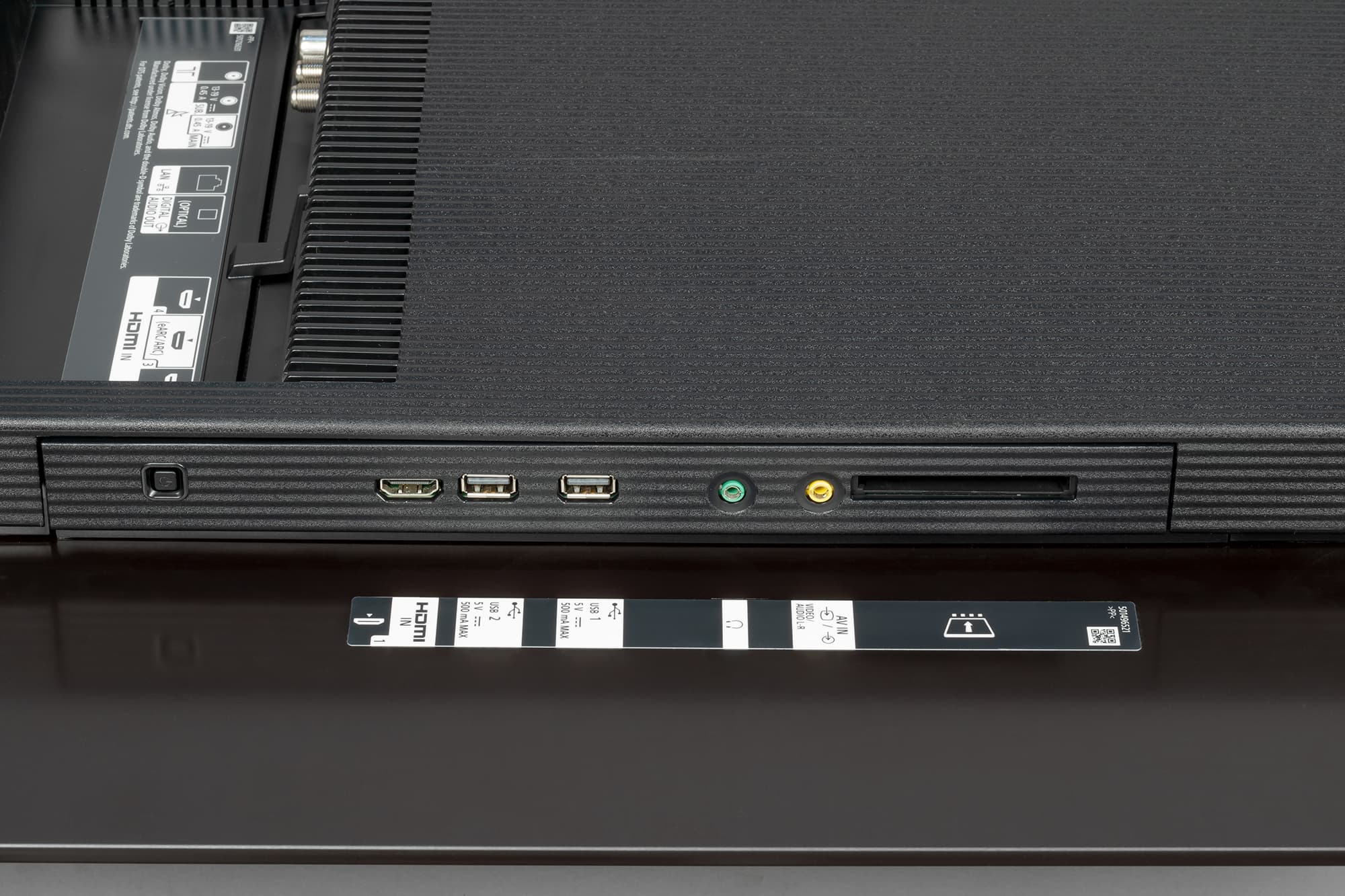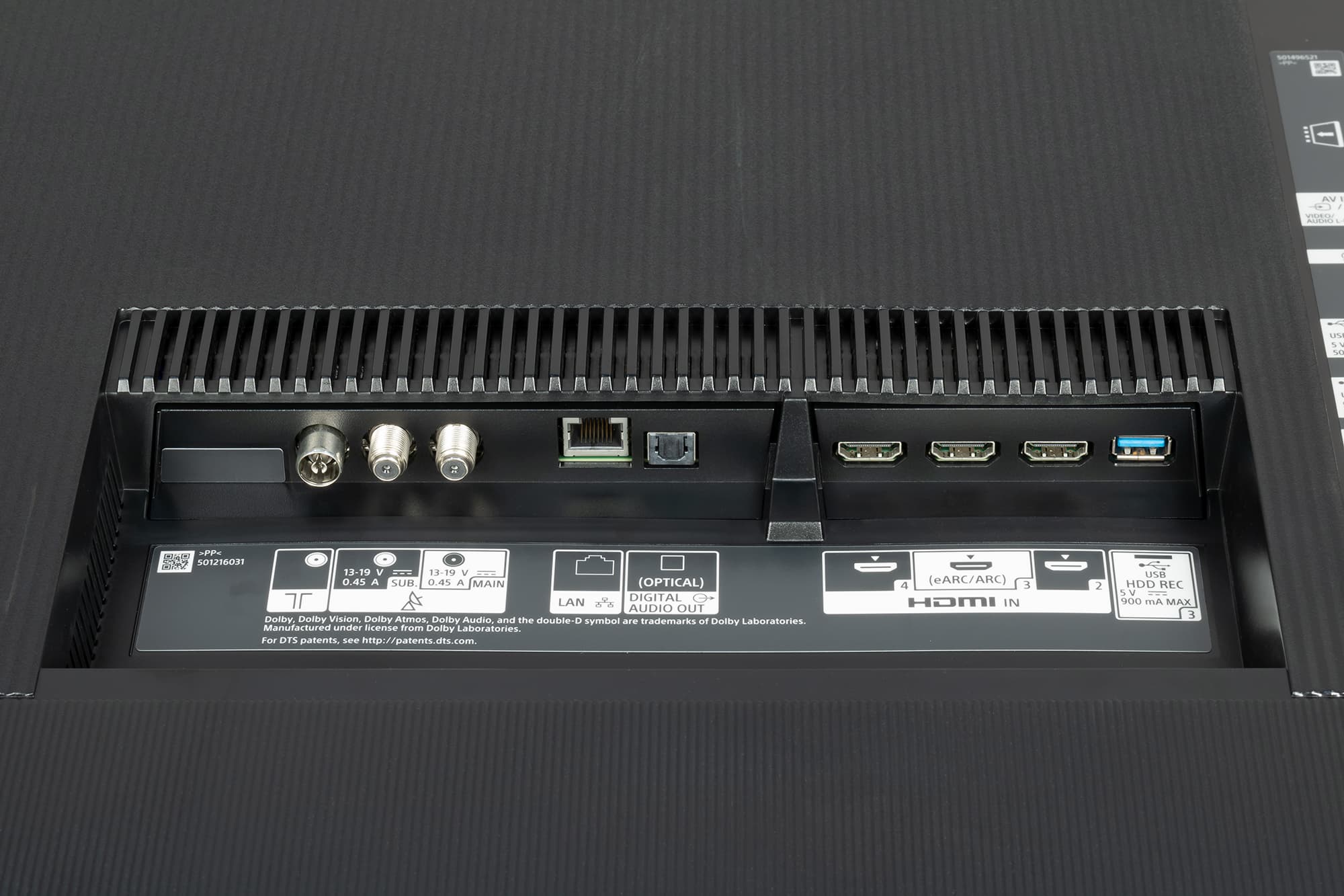 Интерфейсные разъемы размещены в нише на задней панели (направлены вниз) и на левом (от зрителя) торце блока сзади (направлены вбок). К разъемам, направленным вниз, будет не очень удобно подключаться при настенном размещении ТВ, так как ниша хоть и свободная, но замкнутая. К разъемам на торце подключаться удобнее, в частности удобно подключать наушники и USB-накопители. Пониже этих разъемов есть единственная кнопка, с помощью которой можно включать-выключать телевизор и очень ограниченно им управлять без помощи пульта ДУ.