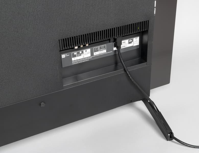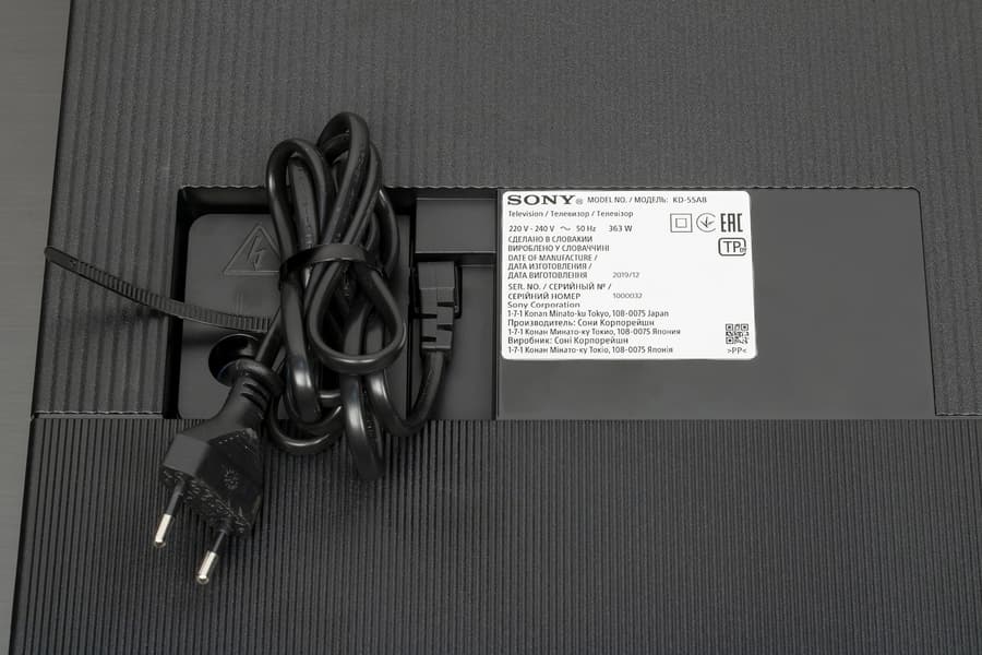 Кабель питания длиной 1,5 м формально несъемный, но под крышкой сзади он соединяется с ТВ при помощи разъема. Его излишки можно смотать и прижать бухту к корпусу кабельной стяжкой, входящей в комплект поставки.
