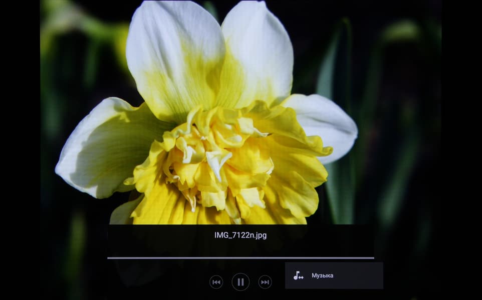 Нет особого смысла тестировать воспроизведение аудиофайлов с помощью встроенного плеера, так как обязательно найдется сторонняя программа, которая с этим справится хорошо и как удобно пользователю. В случае растровых графических файлов возможности встроенного плеера обсудить стоит, так как только он может воспроизводить эти файлы в истинном разрешении 3840×2160. Все сторонние программы, как и сама ОС, выводят статическое изображение в разрешении 1920×1080. Впрочем, как встроенный плеер, так и сторонние программы могут выводить видео в истинном разрешении 3840×2160, используя средства аппаратного декодирования. Нами подтверждена способность штатного плеера телевизора показывать растровые графические файлы в форматах JPEG, в том числе в виде слайд-шоу под фоновую музыку. Эффект перехода один, интервал смены слайдов не настраивается.