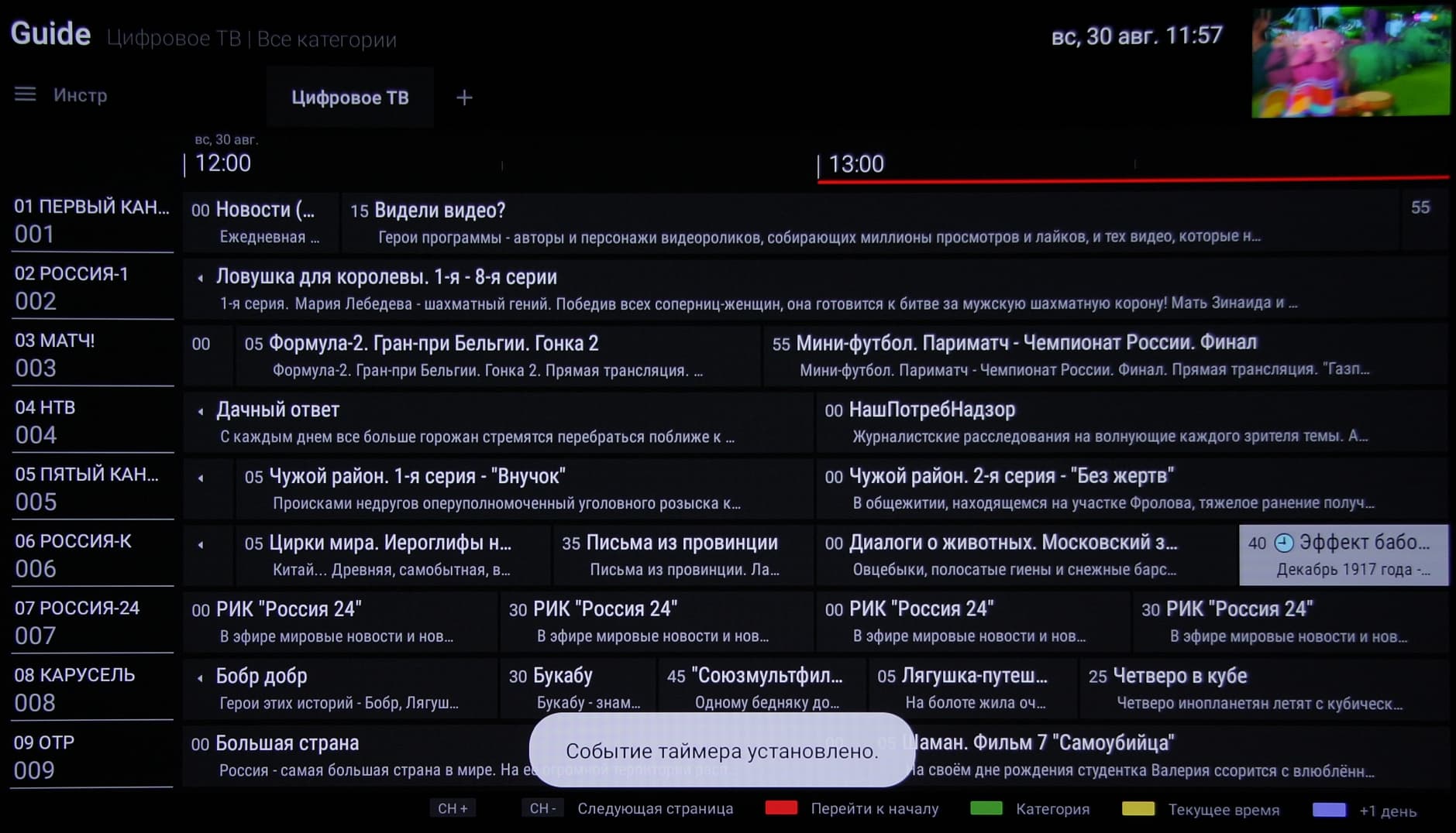 Переключение между цифровыми ТВ-каналами происходит за 3—4,5 секунды, чаще чуть больше, чем за 4 секунды. Есть хорошая поддержка электронной программы передач (если она передается) — можно посмотреть, что именно идет на текущем и других каналах, и запрограммировать просмотр программы или сериала.