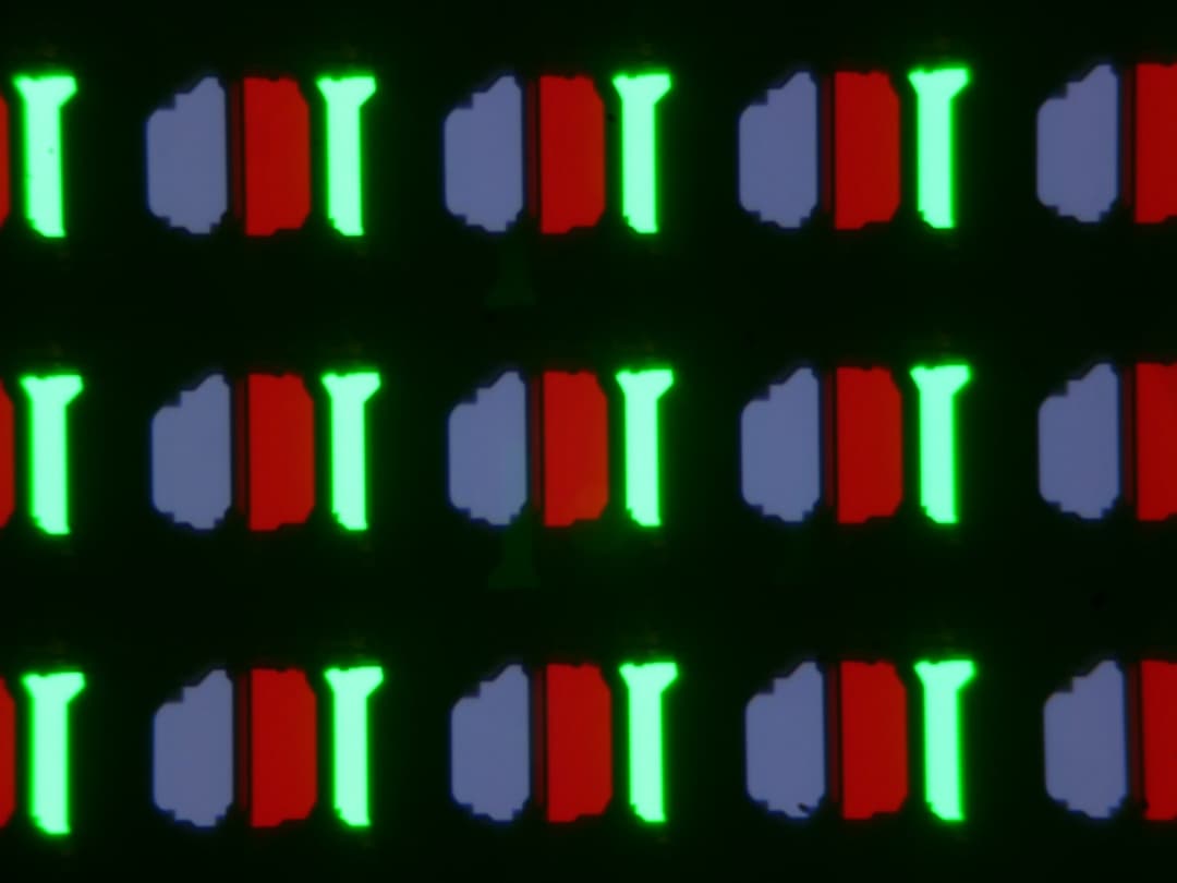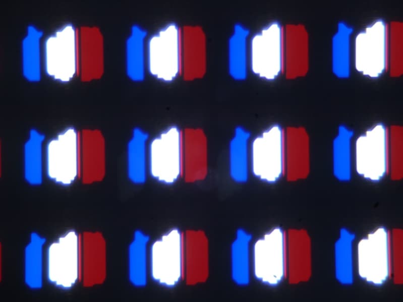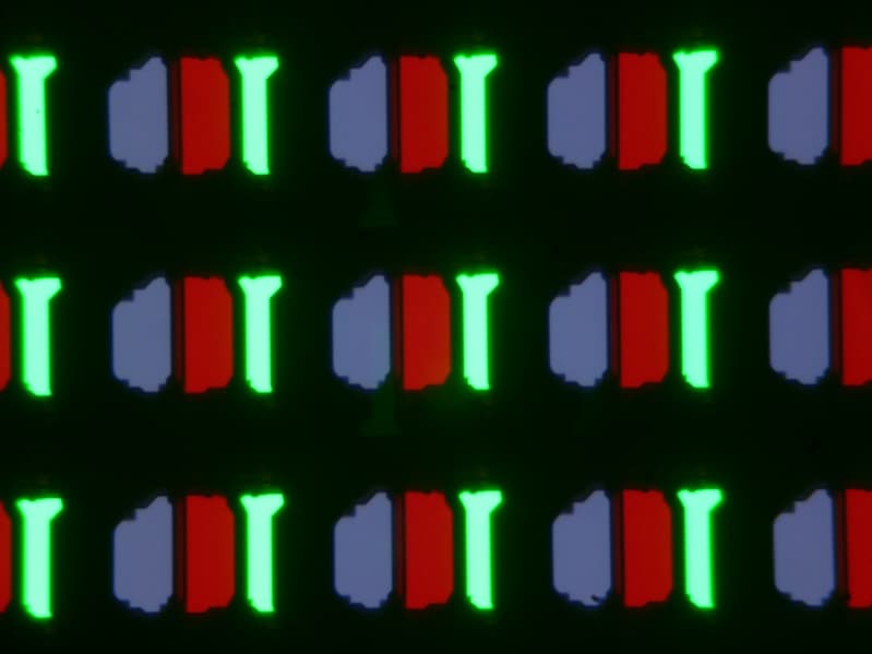 Видно, что светофильтры нанесены вертикальными полосками, как и в случае типичной ЖК-матрицы. При этом белый цвет формируется без участия зеленого субпикселя, так как достаточно свечения белого субпикселя, оттенок которого слегка корректируется добавлением света от красного и синего субпикселя. Зеленый субпиксель появляется, например, при выводе зеленого цвета (микрофотография сделана в режиме sRGB, в котором цветовой охват скорректирован подмешиванием красного цвета и белого):