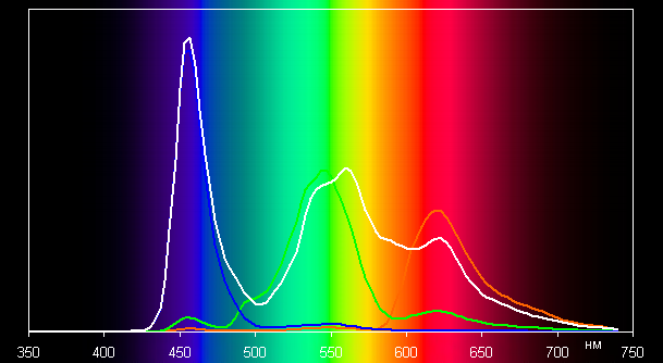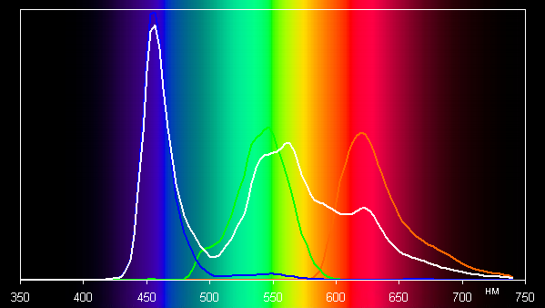 Участие белого субпикселя проявляется в частности в том, что спектр белого явно не является простой суммой спектров красного, зеленого и синего цветов. Отметим, что белый субпиксель позволяет легко смещать баланс яркости белых участков относительно цветных. Тем не менее, визуально дисбаланса яркости не наблюдается.