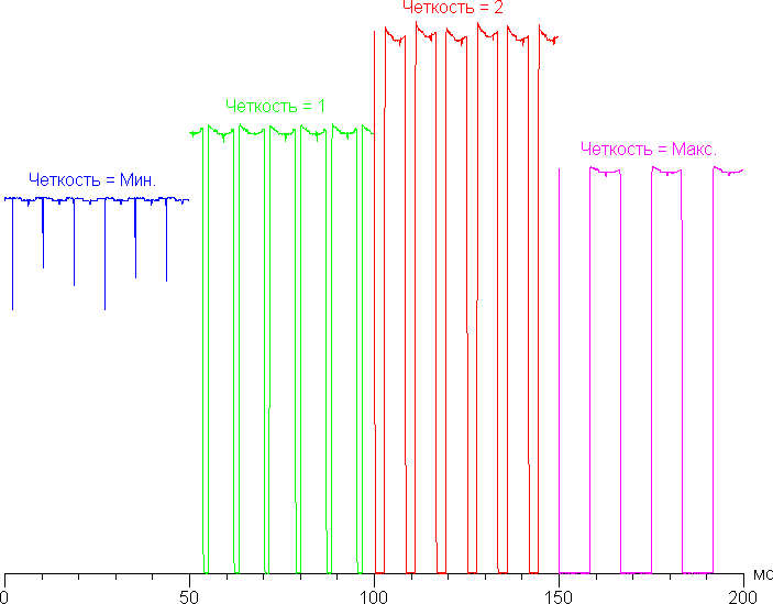 Есть функция, повышающая четкость объектов в движении. Достигается это за счет вставки черного кадра. В зависимости от значения настройки Четкость в группе Motionflow вставляется короткий черный кадр с частотой 120 Гц, или длинный черный кадр с частотой 60 Гц. В первом случае при значении 2 действительно есть какое-то увеличение четкости в движении, а видимого мерцания практически нет, во втором случае экран уже неприятно мерцает. Приведем графики зависимости яркости (вертикальная ось) от времени (горизонтальная ось) при различных значениях настройки Четкость:
