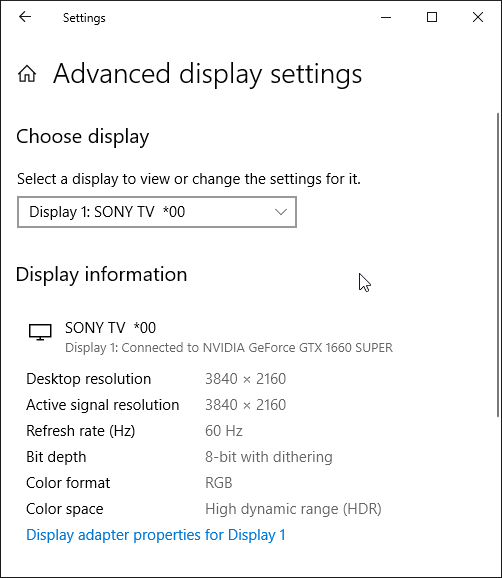 Под Windows 10 вывод в режиме HDR на данный телевизор возможен при выборе соответствующей опции в настройках дисплея. При разрешении 4К и 60 Гц вывод идет в режиме 8 бит на цвет, дополненных динамическим смешением цветов, видимо, с помощью видеокарты на аппаратном уровне. При 30 Гц и ниже — 12 бит на цвет (за 10-битый вывод отвечает уже сам ТВ):