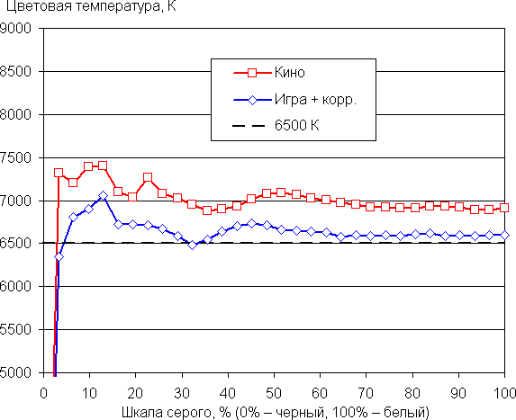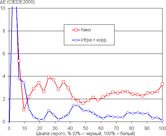 Графики ниже показывают цветовую температуру на различных участках шкалы серого и отклонение от спектра абсолютно черного тела (параметр ΔE) для профиля Кино и для профиля Игры с отключением всех улучшающих изображений функций и после ручной подстройки цветового баланса настройками усиления трех основных цветов (0/−3/−4 для R, G и B):