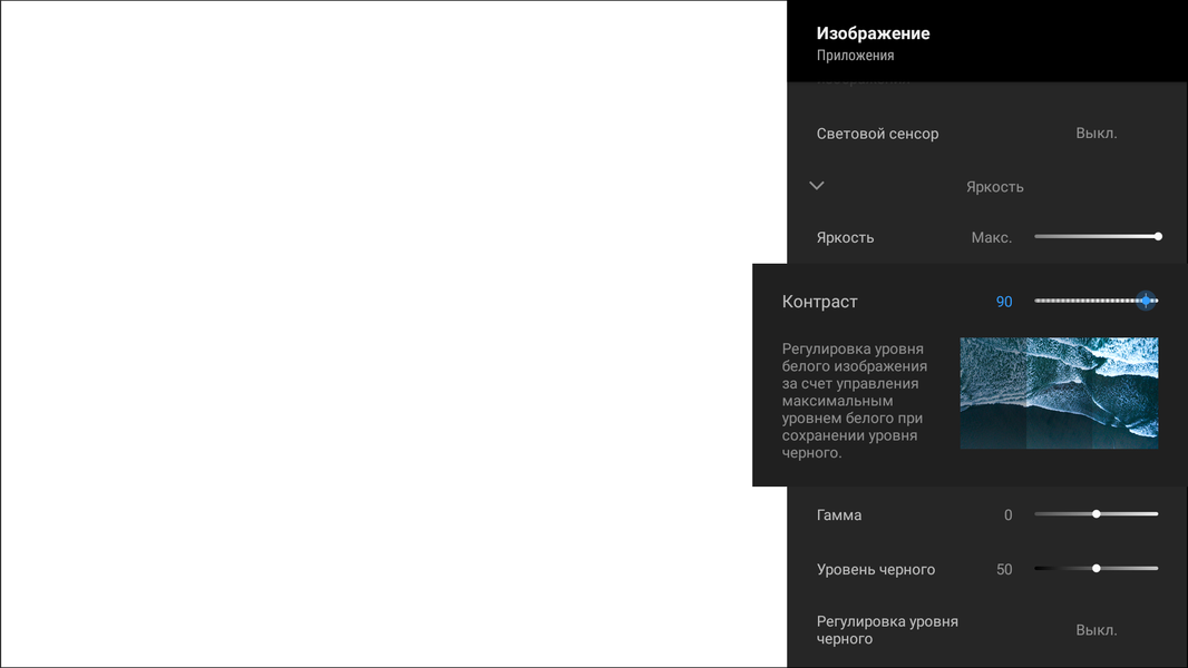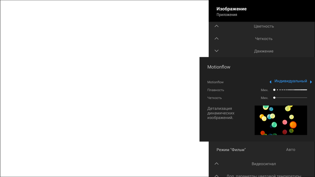 Во время навигации по меню с настройками изображения все постоянно разворачивается/сворачивается и скачет вверх-вниз. Это очень раздражает и замедляет настройку ТВ. Единственная приятная функция этого меню в том, что при выборе конкретной настройки «украшательства» исчезают, остается только небольшой прямоугольник с названием настройки и ползунком или текущим вариантом, при этом следующая/предыдущая настройка выбирается стрелками вниз и вверх, а значение меняется стрелками вправо и влево.