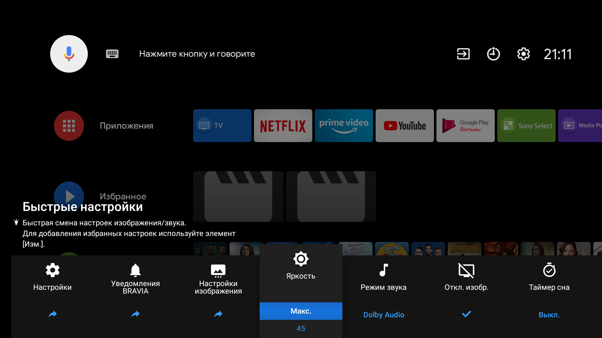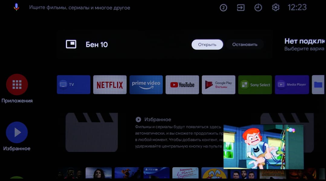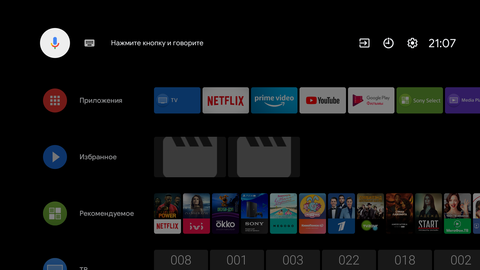 Есть возможность переключить интерфейс на русский язык (обычно это делается во время первоначальной настройки телевизора). Качество перевода хорошее. Домашняя страница в Android TV представляет собой несколько горизонтальных лент с плитками установленных приложений, рекомендуемого и избранного контента, а также часто просматриваемых каналов ТВ. Кружки с подписями слева поясняют, к чему относятся содержимое лент, и позволяют запустить соответствующую программу. В верхней части страницы есть значки-кнопки голосового и текстового ввода строки поиска, для вывода системных уведомлений, выбора входов, для доступа к таймерам и настройкам, а также часы. Настройки домашней страницы позволяют пользователю многое на ней менять. Отметим, что в целом ни к стабильности работы, ни к отзывчивости оболочки у нас претензий не возникло.