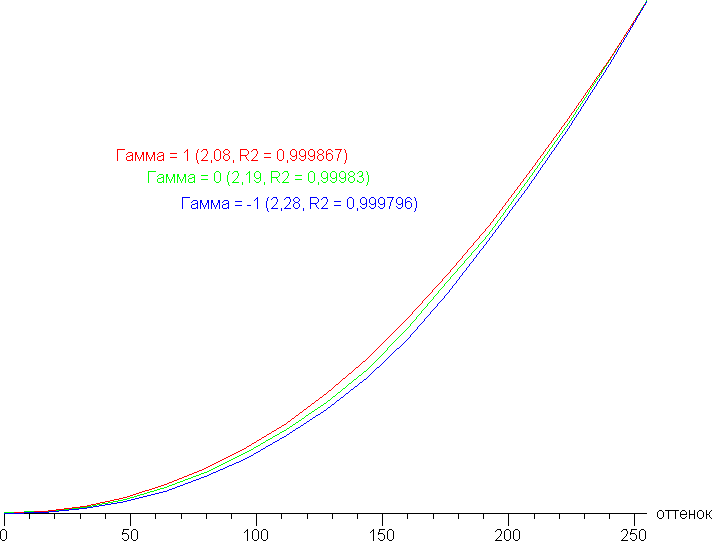 Для оценки характера роста яркости на шкале серого мы измерили яркость 17 оттенков серого при различных значениях параметра Гамма. На графике ниже приведены полученные гамма-кривые (значения показателей аппроксимирующей функции приведены в скобках в подписях, там же — коэффициент детерминации):
