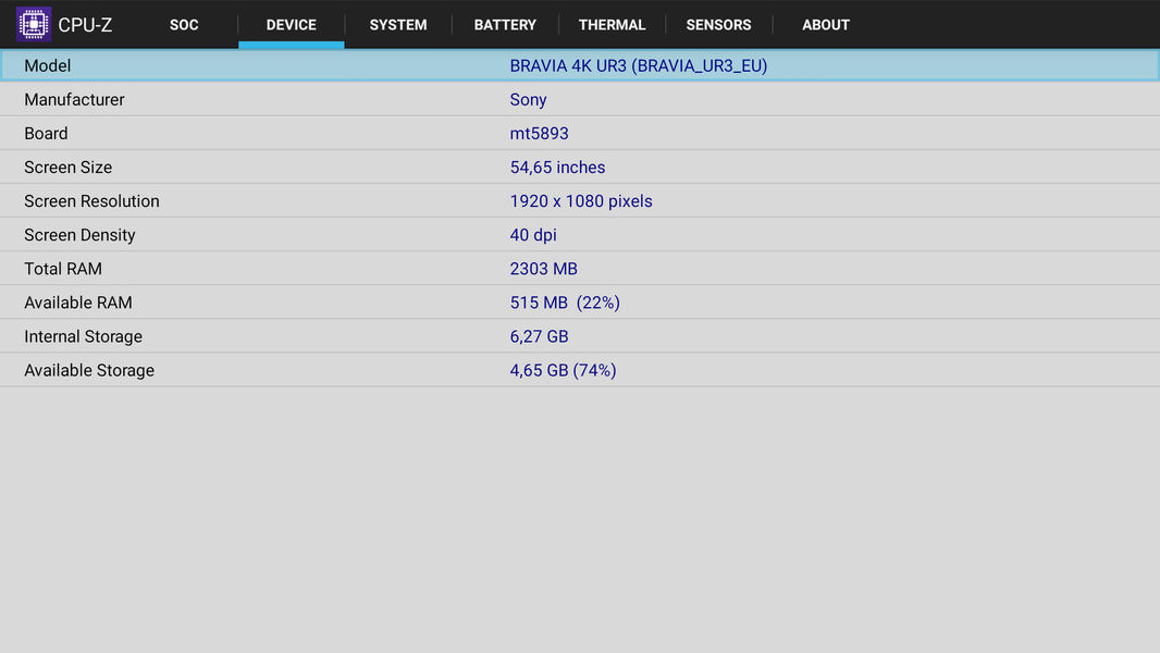 Программной платформой для этого ТВ служит Android TV, основанная на ОС Android версии 9. Конфигурацию аппаратной части поясняют данные программы CPU-Z: