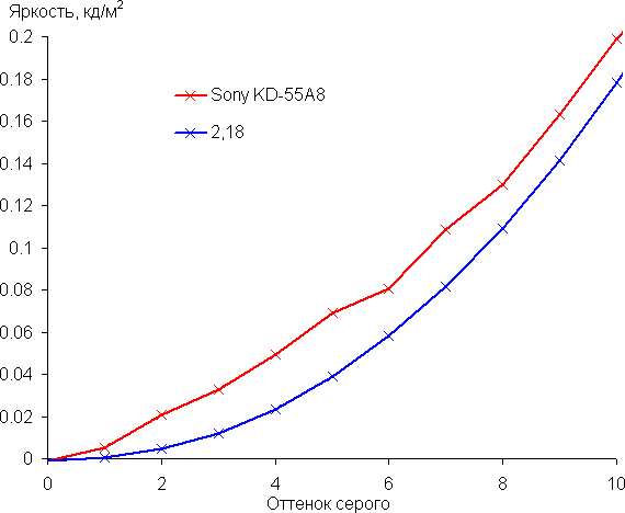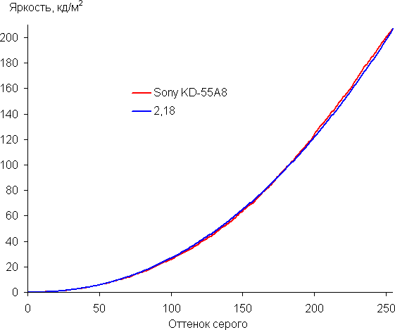 Аппроксимация полученной гамма-кривой дала показатель 2,18, что близко к стандартному значению 2,2, при этом реальная гамма-кривая немного отклоняется от аппроксимирующей степенной функции: