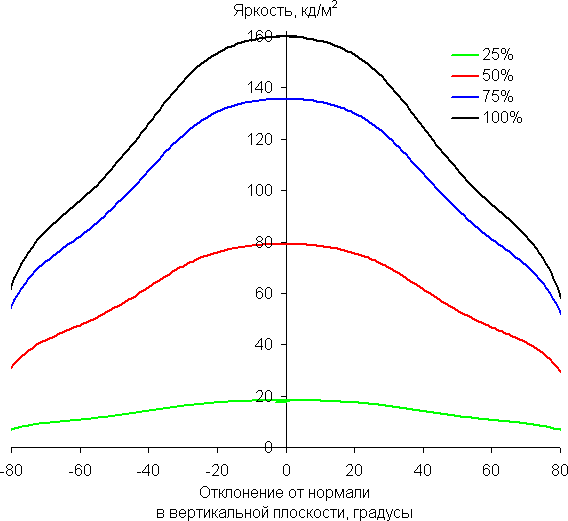 Отметим очень плавное уменьшение яркости при отклонении от перпендикуляра к экрану во всех трех направлениях, при этом графики яркости полутонов не пересекаются во всем диапазоне измеряемых углов. Для сравнения: в случае типичного ЖК-телевизора на матрице VA яркость падает вдвое уже примерно при 30°.