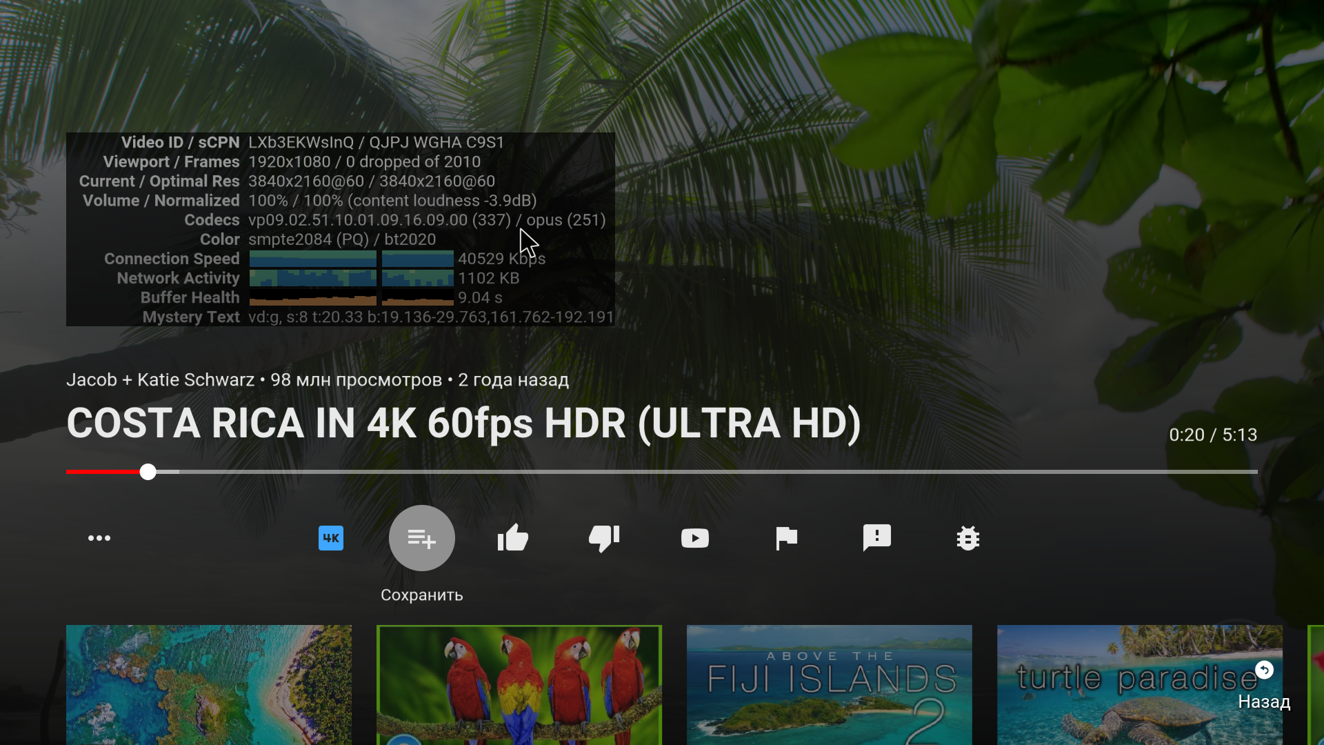 Тестирование воспроизведения видеофайлов проводилось в основном с помощью плеера MX Player. Поддерживается аппаратное декодирование звуковых дорожек как минимум в форматах (и их разновидностях) AAC, AC3, DTS, MP2, MP3, OGG, PCM и WMA. Большинство из опробованных современных файлов высокого разрешения без проблем воспроизводились в режиме аппаратного декодирования (в некоторых случаях в режиме HW+), вплоть до вариантов H.265 с разрешением 4К при 60 кадр/с. Поддерживается воспроизведение видеофайлов HDR (HDR10 и HLG; контейнеры: MKV, MP4, TS и WebM; кодеки VP9 и H.265), а в случае файлов с 10 бит на цвет согласно визуальной оценке градаций оттенков больше, чем у 8-битных файлов. Кстати, в приложении YouTube удалось посмотреть видео в разрешении 4K с HDR и даже с 60 кадр/с (цвета бледные, так как это программный снимок HDR-видео с экрана).