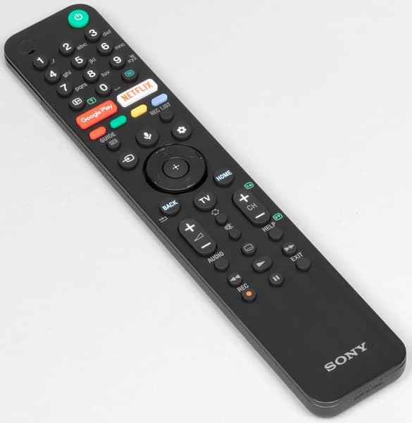 Корпус пульта изготовлен из черного пластика с матовой поверхностью. Кнопки изготовлены в основном из резиноподобного материала, и только кольцо курсорных кнопок — из твердого пластика. Обозначения кнопок контрастные. Самих кнопок много, но расположены они достаточно свободно, чтобы нажимать на них было удобно, хотя перехватывать пульт, конечно, приходится. Пульт гибридный, он может работать как по ИК, так и по Bluetooth. По ИК пульт работает до сопряжения с телевизором или тогда, когда телевизор находится в глубоком сне или отключен от сети. Во всех остальных случаях ИК-передатчик не работает, и команды передаются по Bluetooth, за исключением команды на включение/выключение — она всегда передается только по ИК. Подсветки, к сожалению, нет, но в передней части есть индикатор, который в некоторых случаях светится оранжевым, и отверстие микрофона. Голосовой помощник Google запускается при нажатии на кнопку с микрофоном, также его можно запустить с домашней страницы. Этот помощник поможет найти контент, который предоставляют ряд программ, и ответить на какие-то вопросы (показывает и проговаривает ответ), например, какая сейчас погода за окном. Однако непосредственно с самим ТВ интеграции почти нет, — голосом получается по названию выбирать ТВ-каналы, входы, запускать программы, а в некоторых программах можно наговаривать текст для поиска, но, например, изменить голосом яркость или громкость не получается.