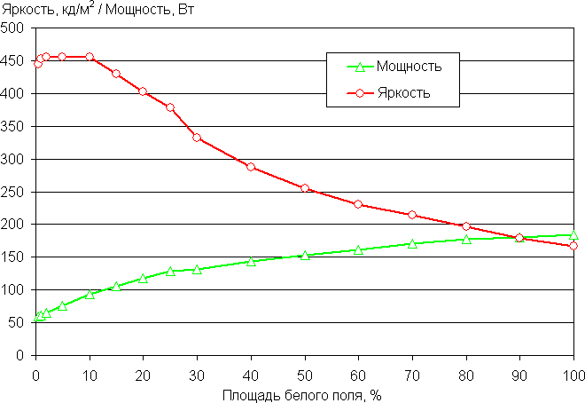 С уменьшением площади белого максимальная яркость возрастает, при этом характер зависимости яркости от площади белого участка зависит как минимум от выбранного профиля, настроек изображения и от текущего режима: SDR или HDR. Например, в режиме Игра в случае сигнала HDR зависимость яркости от площади белого имеет следующий вид (дополнительно по вертикальной оси отложена потребляемая мощность):