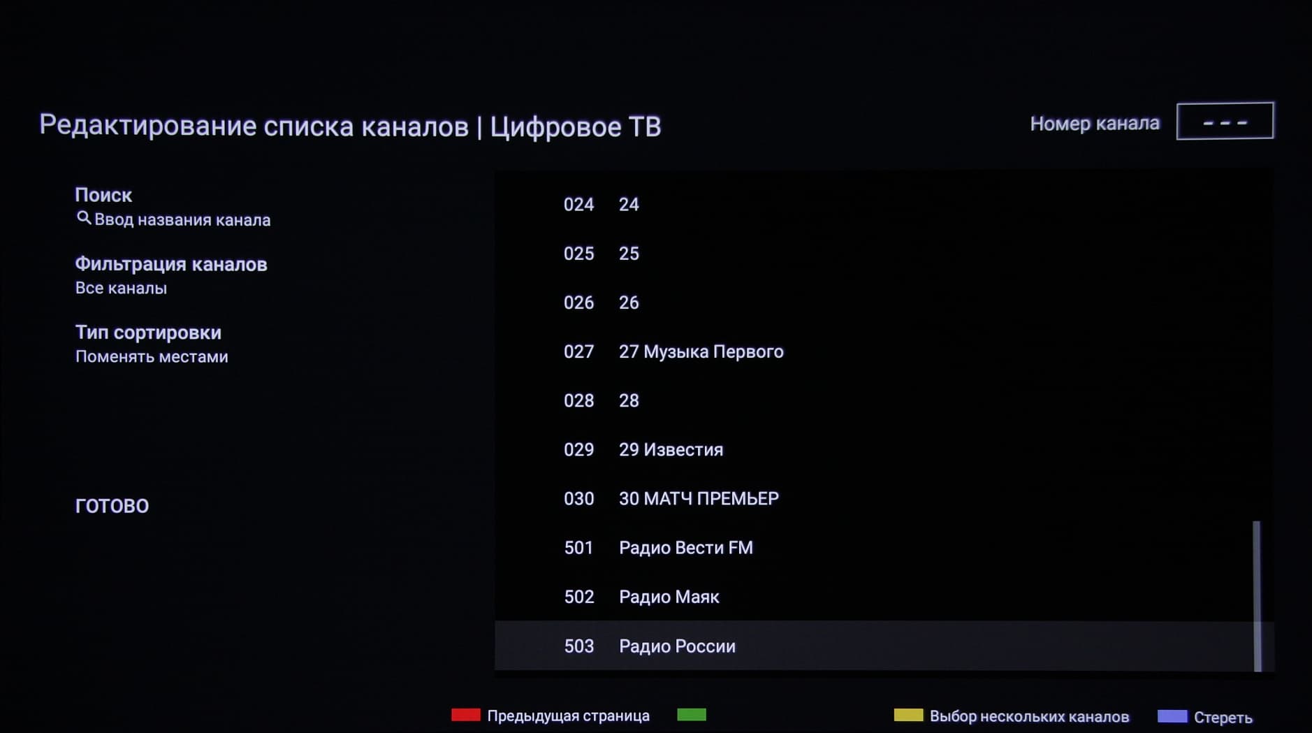 Меню с настройками ТВ занимает большую часть экрана, надписи в нем читаемые. Некоторое неудобство заключается в том, что списки в меню не зациклены.