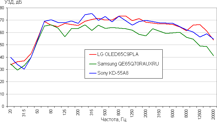 Сравним АЧХ этого ТВ с АЧХ двух телевизоров высшего класса (получена с помощью шумомера при воспроизведении звукового файла с розовым шумом, интервал УЗД в 1/3 октавах):