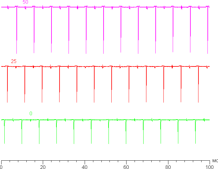 На любом уровне яркости видимое мерцание отсутствует, его не выявляет и тест на стробоскопический эффект. Регистрация зависимости яркости от времени при различных уровнях яркости выявила модуляцию яркости с очень высоким коэффициентом заполнения, что и объясняет отсутствие мерцания. В доказательство приведем графики зависимости яркости (вертикальная ось) от времени (горизонтальная ось) при различных значениях настройки Яркость в случае белого поля на 5% от площади экрана.