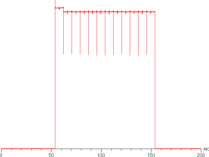 При выводе белого поля есть небольшое динамическое изменение яркости. Для примера приведем график изменения яркости (вертикальная ось) от времени (горизонтальная ось) в случае перехода между черным и белым и обратно для вывода белого поля на 5% площади экрана: