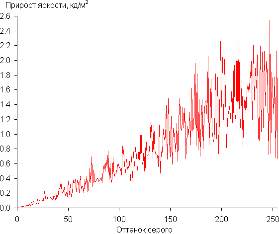 Реальная гамма-кривая ближе к стандартной в случае варианта Гамма = 0 (так по умолчанию), поэтому далее мы измерили яркость 256 оттенков серого (от 0, 0, 0 до 255, 255, 255) при этом значении. График ниже показывает прирост (не абсолютное значение!) яркости между соседними полутонами: