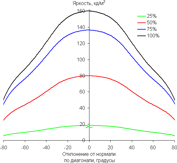 Чтобы выяснить, как меняется яркость экрана при отклонении от перпендикуляра к экрану, мы провели серию измерений яркости белого и оттенков серого в центре экрана в широком диапазоне углов, отклоняя ось датчика в вертикальном, горизонтальном и диагональном (из угла в угол) направлениях. Яркость черного поля по понятным причинам не определялась, как и контрастность.
