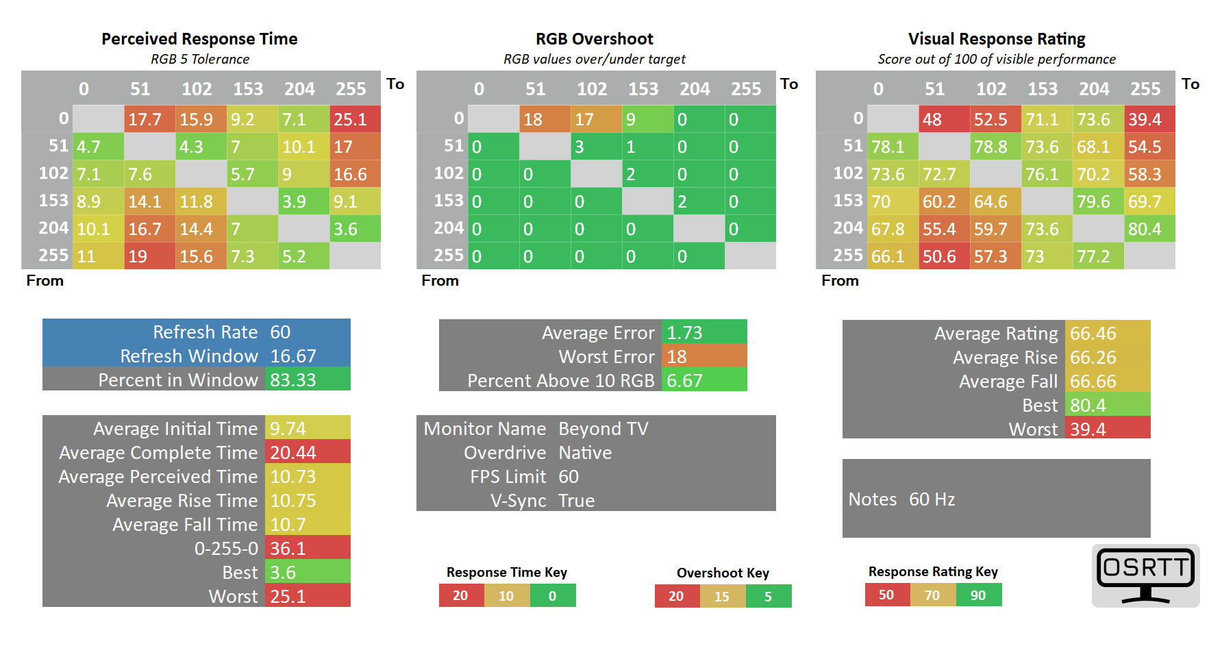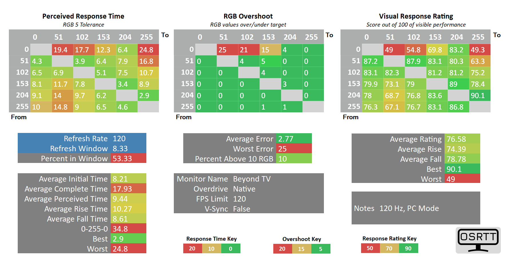 Выше приведены результаты измерения программно-аппаратным комплексом OSRTT, для которого в качестве референсного метода оценки скорости отклика выбран строгий допуск RGB 5 после нормализации значения гаммы в ходе автоматической оценки заводского значения. Данный вариант оценки скорости задает более жесткие стандарты, чем типичные для методики измерений со стороны производителей (время перехода по уровню яркости 10%—90%, без учета различий гаммы и артефактов).