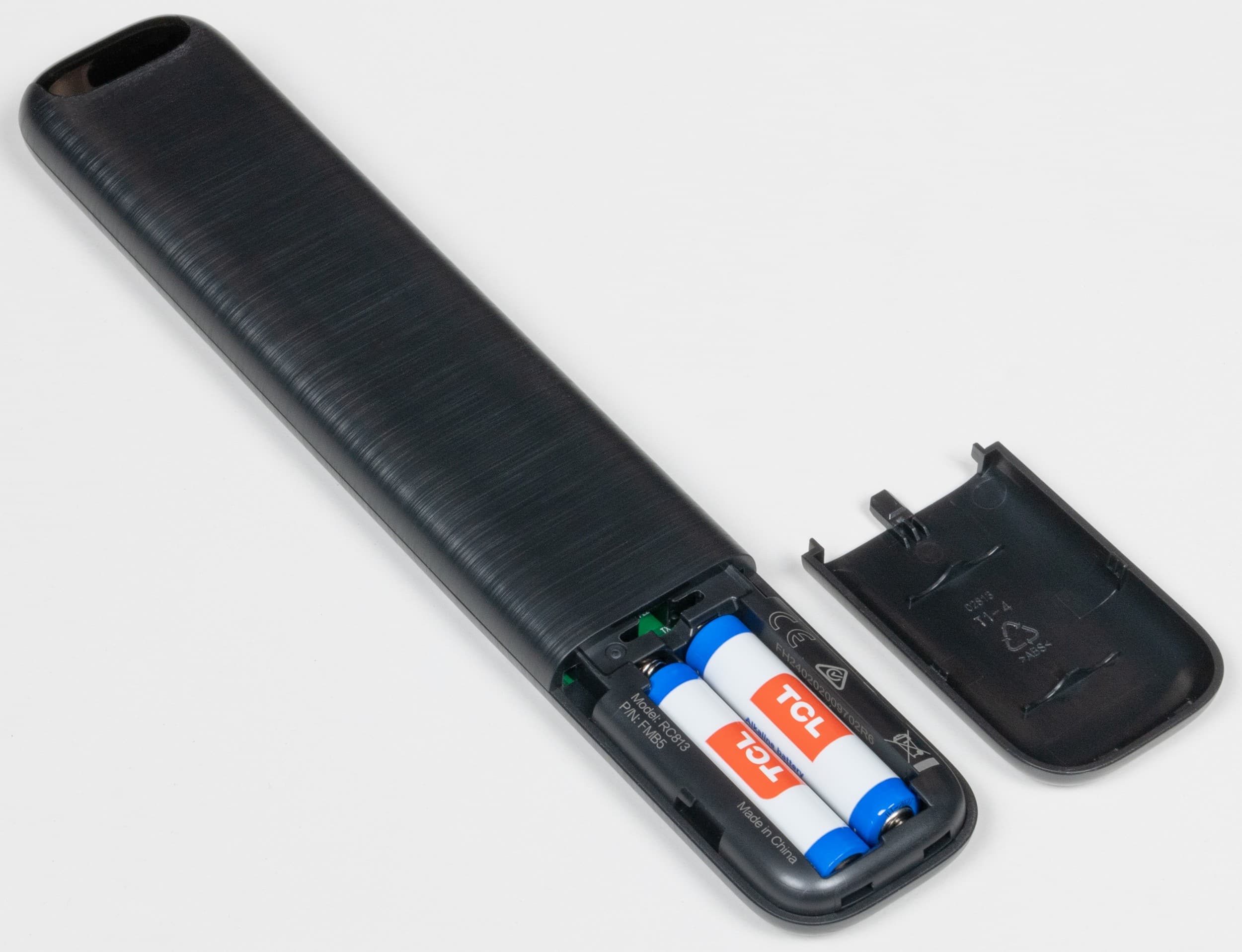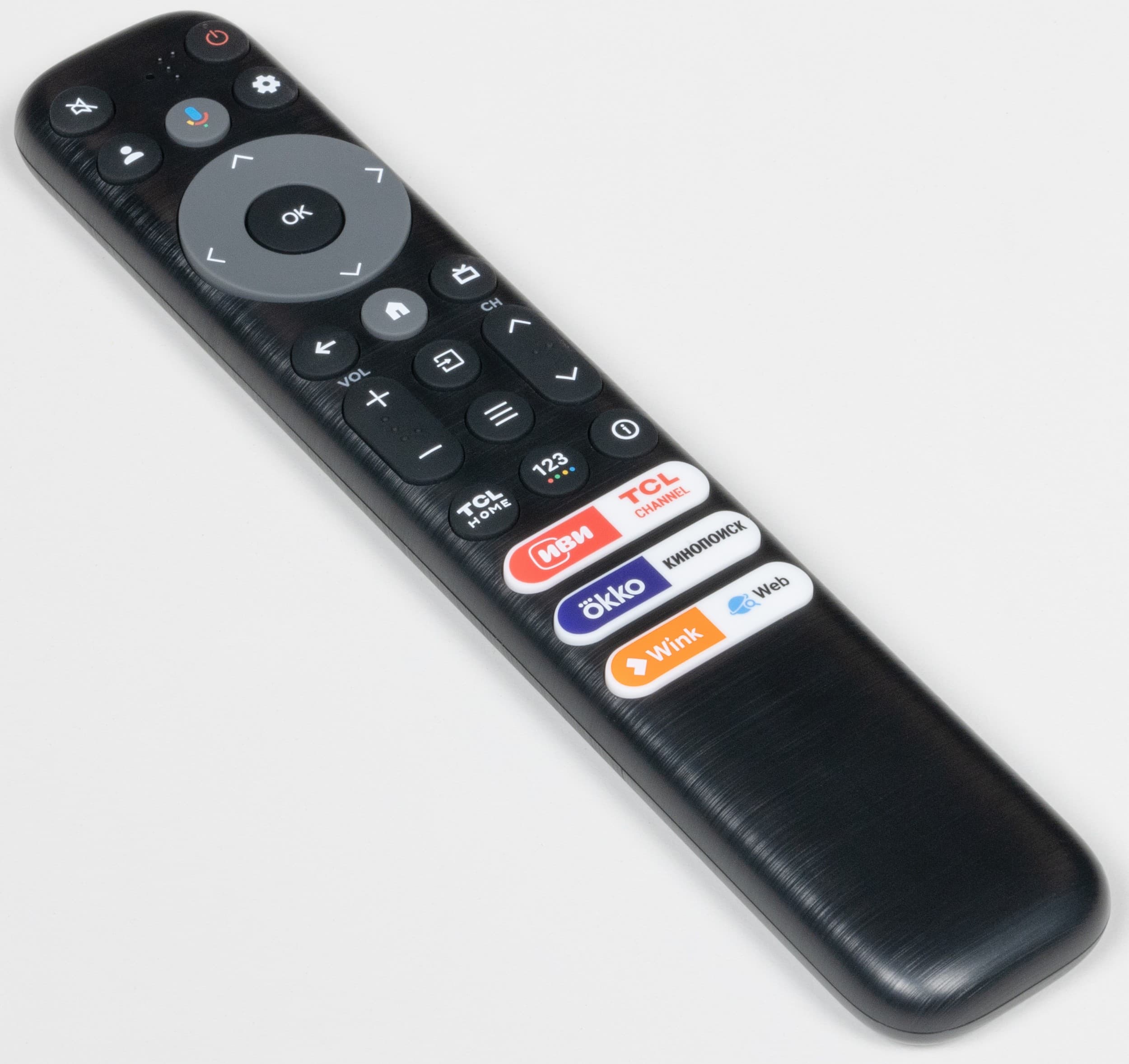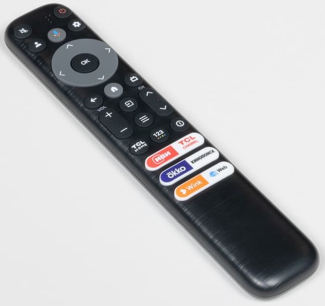 Основным элементом управления телевизора TCL 85C855 выступает крупный пульт ДУ. Он изготовлен из черного пластика с полуматовой поверхностью и текстурой под шлифованный металл. Кнопки белого и черного цветов изготовлены из резиноподобного материала. Обозначения кнопок контрастные, основные кнопки достаточно крупные, как и надписи на них. Есть несколько рядов вспомогательных кнопок, две качельки, отвечающие за регулировку громкости и переключение каналов, и три крупные клавиши быстрого доступа к известным российским сервисам и собственному приложению TCL для просмотра IPTV — максимально правильный выбор компании для официально поставляемого на территорию РФ телевизора.