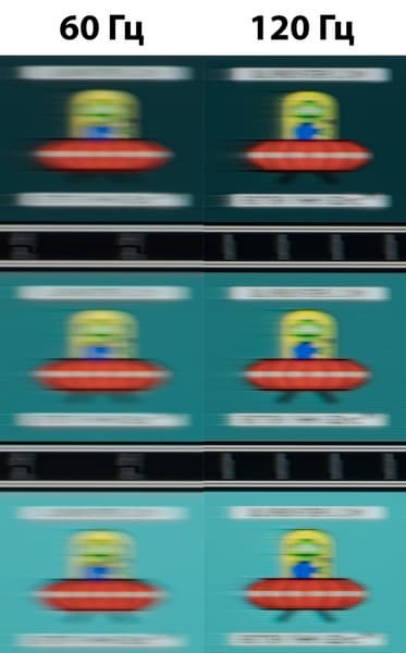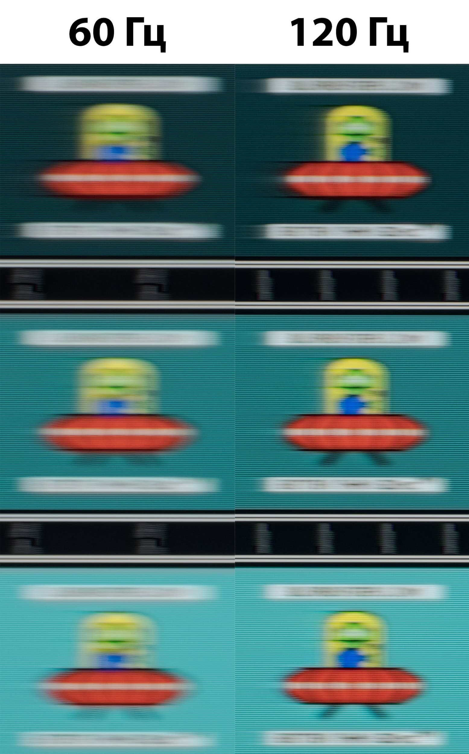 Для наглядного представления о том, что на практике означает такая скорость матрицы, приведен снимок выше, полученный с помощью движущейся камеры. Подобные снимки показывают, что видит человек, если он следит глазами за двигающимся на экране объектом. Очевидно, что переход от классических 60 Гц к 120 Гц приносит ощутимые изменения — визуально сильно увеличивается плавность всего происходящего на экране. Однако это актуально только в случае подключения к ПК или к игровым консолям, которые могут выдать соответствующий уровень fps.