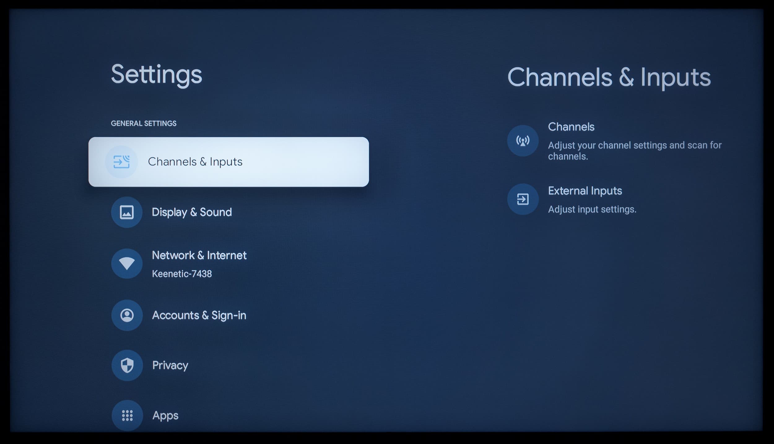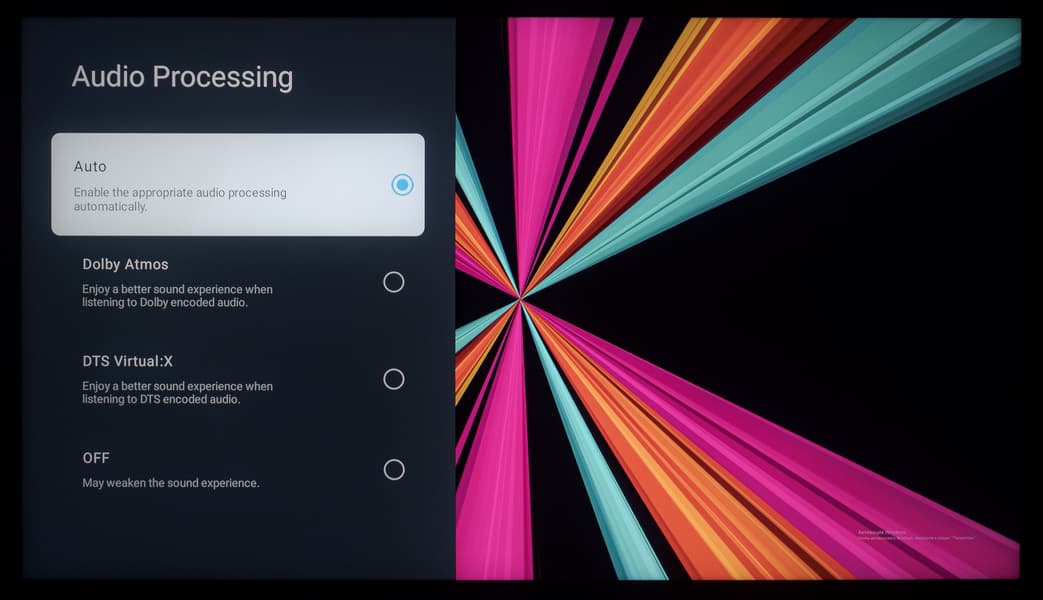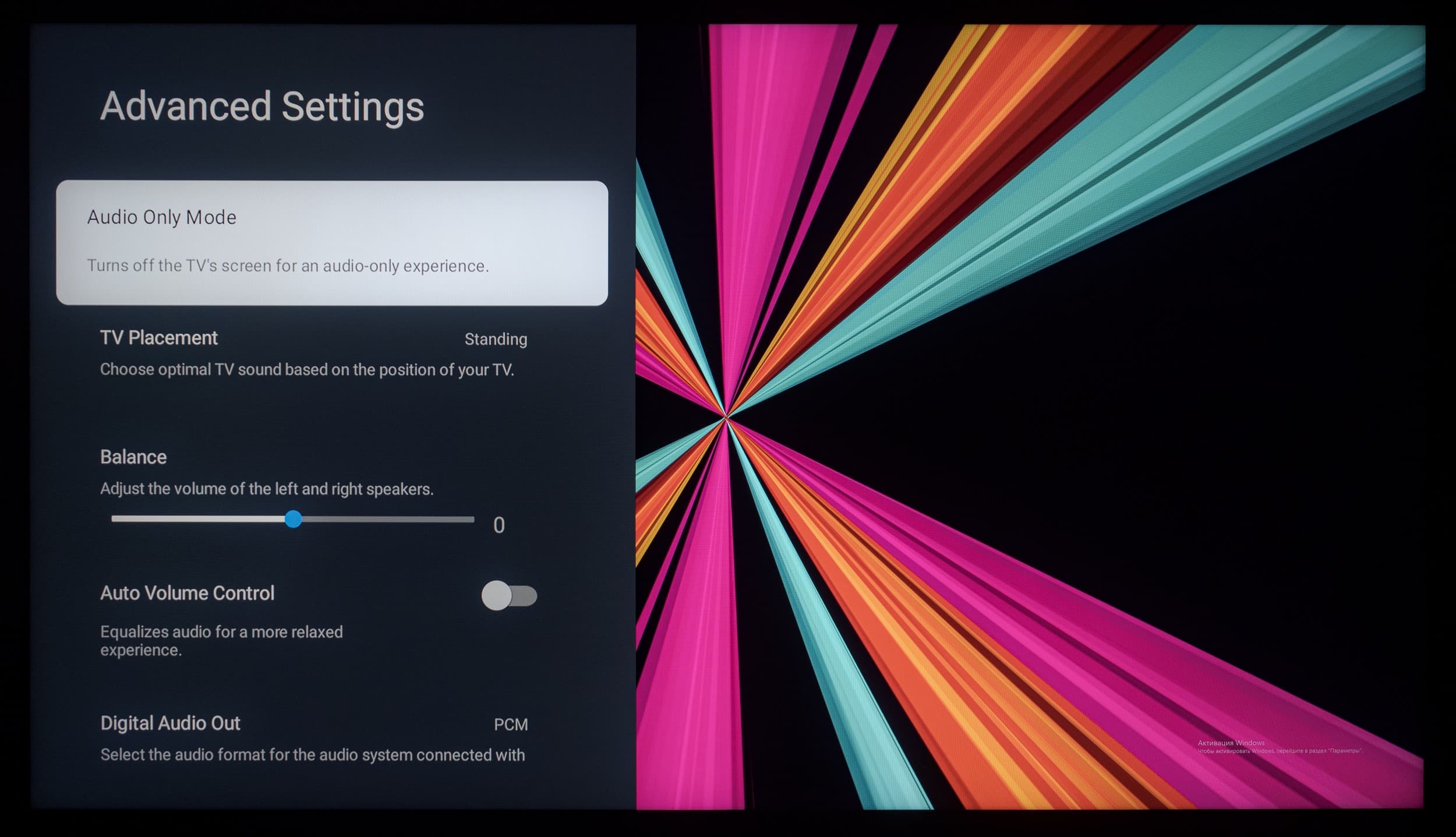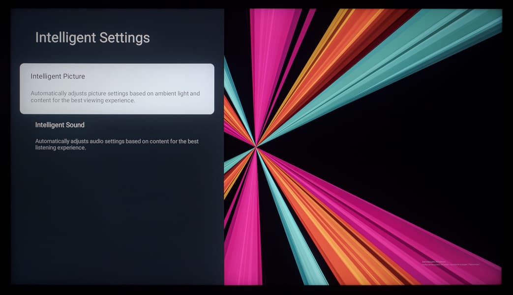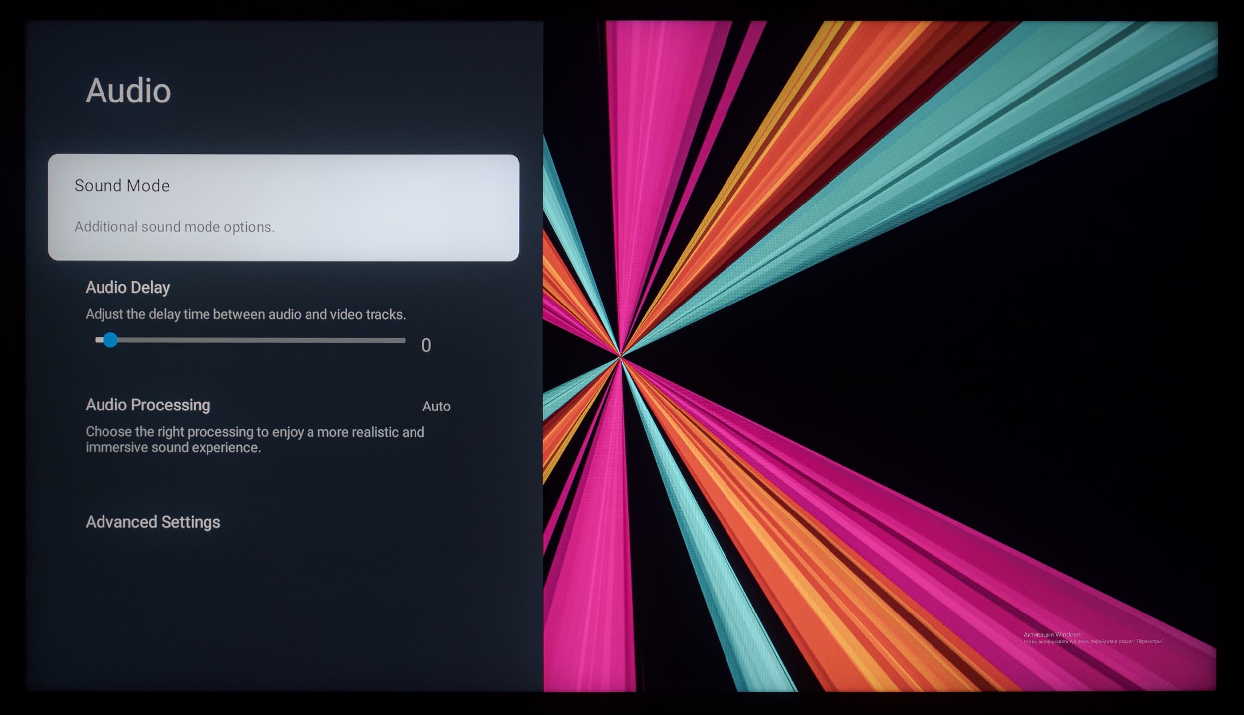 Что касается всех остальных настроек, то из-за использования оболочки Google TV они перебрались на отдельный экран, закрывающий собой воспроизводимый контент. Основной OSD-экран построен по принципам блочной структуры, со сдвигом вправо при наличии дополнительных подразделов.