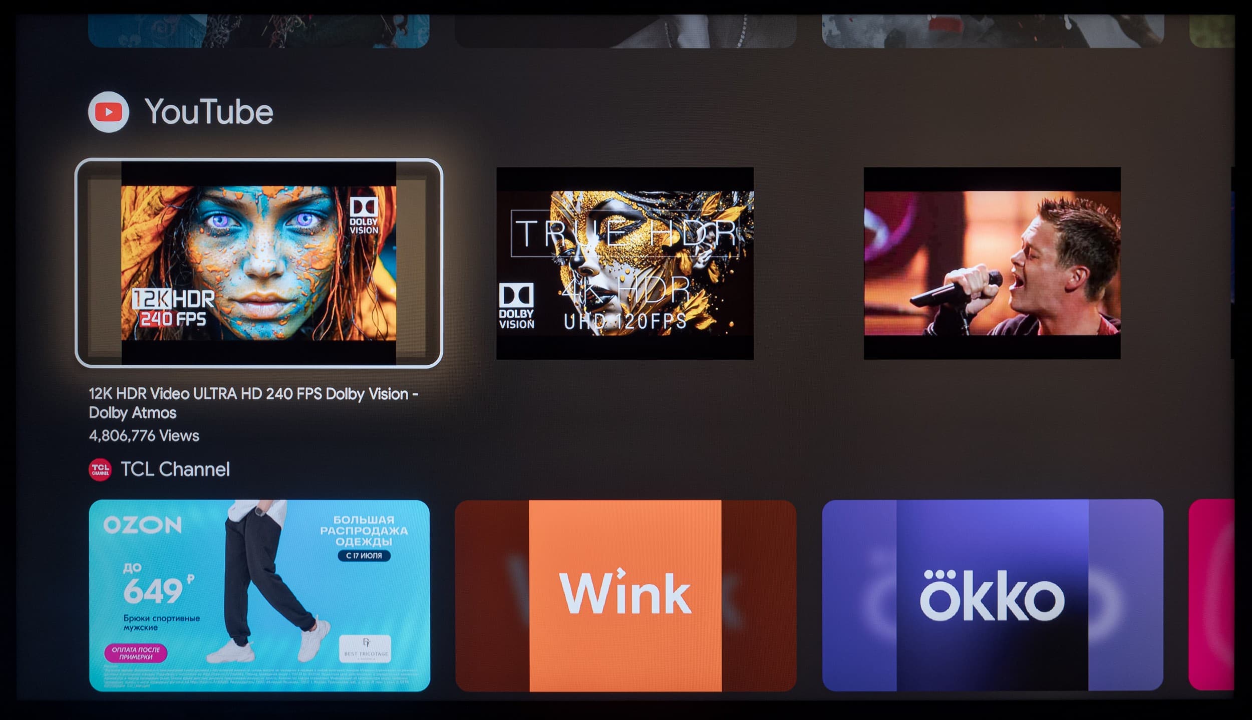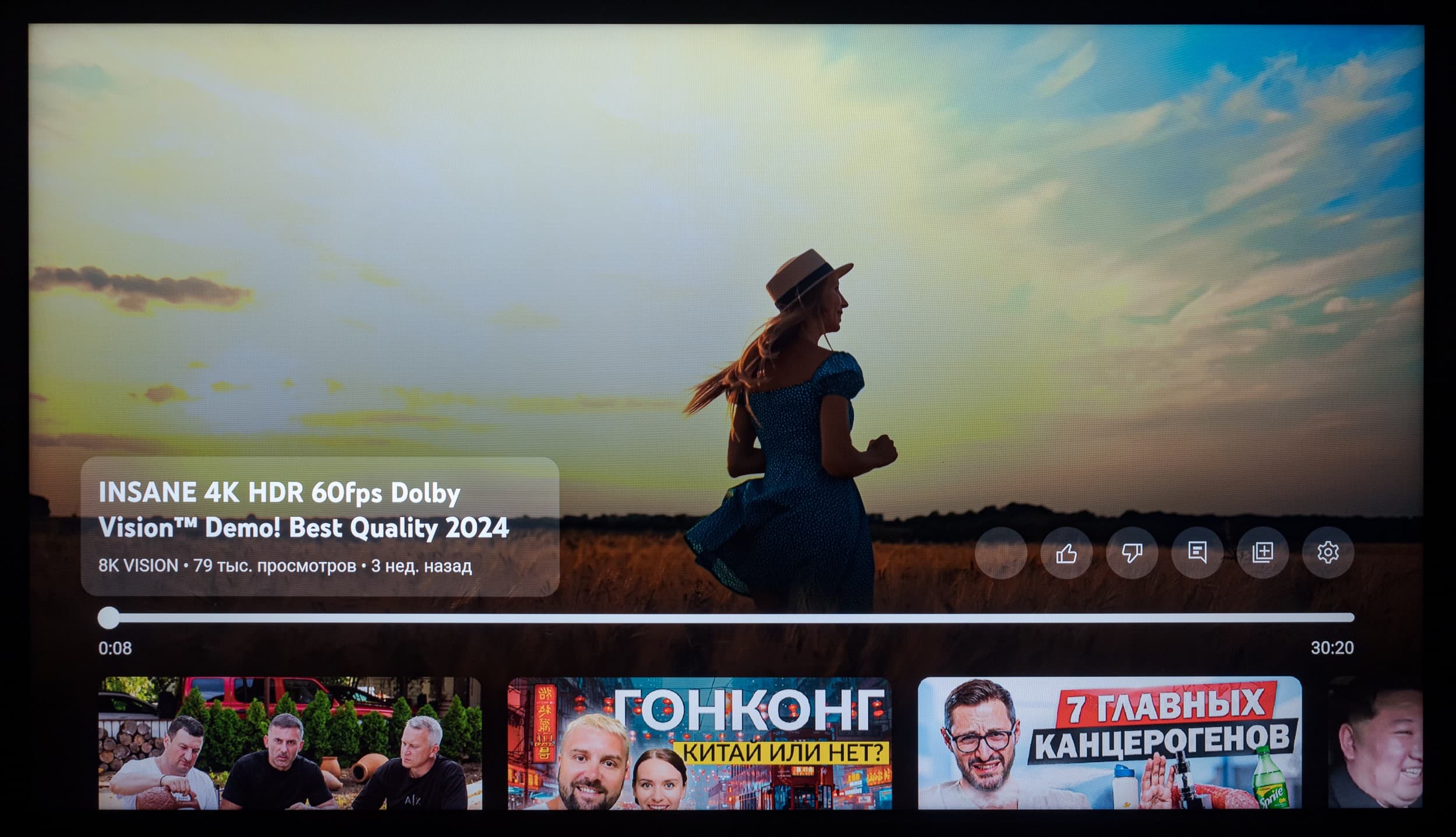 В случае возникновения проблем и подтормаживаний рекомендуем дать системе время на обдумывание всех нажатых клавиш и выбранных действий либо произвести перезагрузку системы и больше так не делать. К слову, частичный пропуск кадров на роликах 4K UHD 60p и с HDR происходит именно из-за дополнительной нагрузки на систему (запуск меню, изменение настроек, много нажатий на клавиши пульта ДУ), и премиальный ТВ TCL эта участь, увы, не обошла стороной. Стоит учитывать эту особенность, особенно если вы рассчитываете, что телевизор за 300 тысяч должен «летать» всегда и везде.