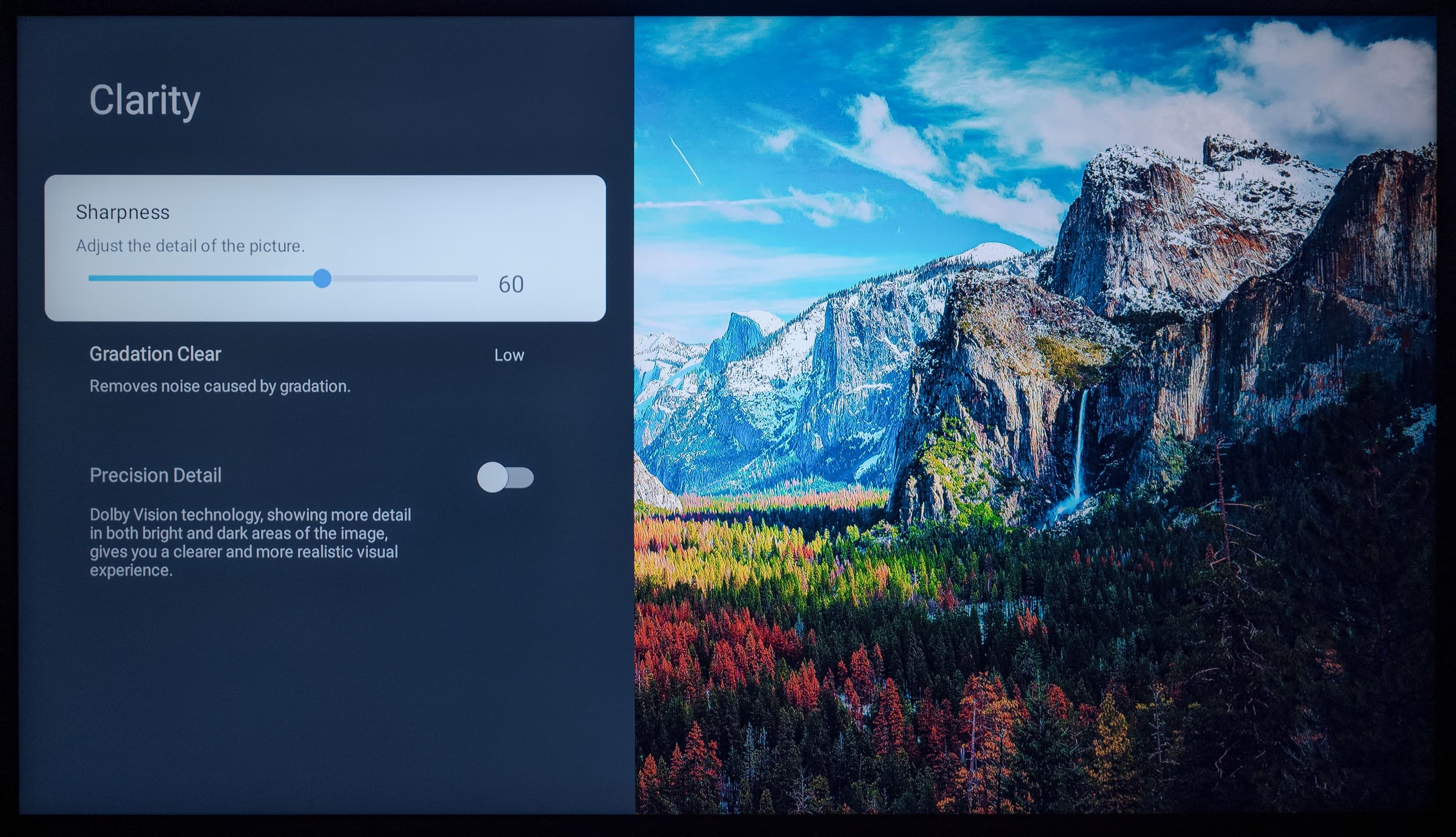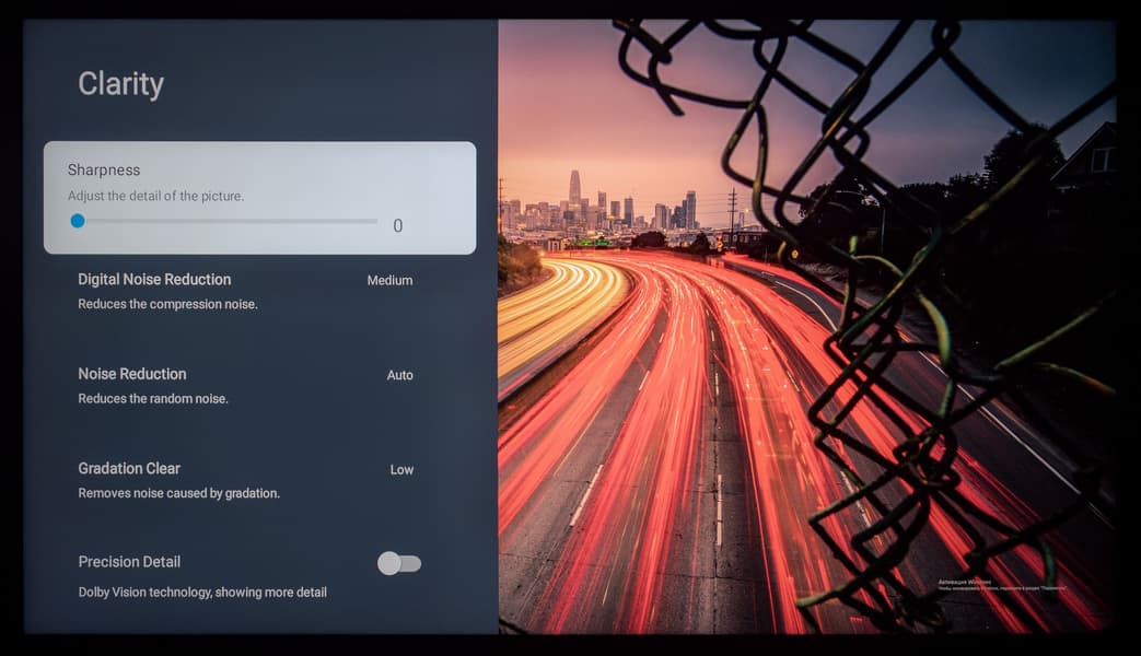 Резкость у экрана ТВ достаточная, проблем с выводом тонких линий и текстовых полей не отмечено. Вопросы к качеству отображения возникают только в определенных режимах изображения, в которых производитель, непонятно для чего, повысил резкость до 50%-100%. При этом нативная резкость используемой матрицы достигается на уровне 0%.