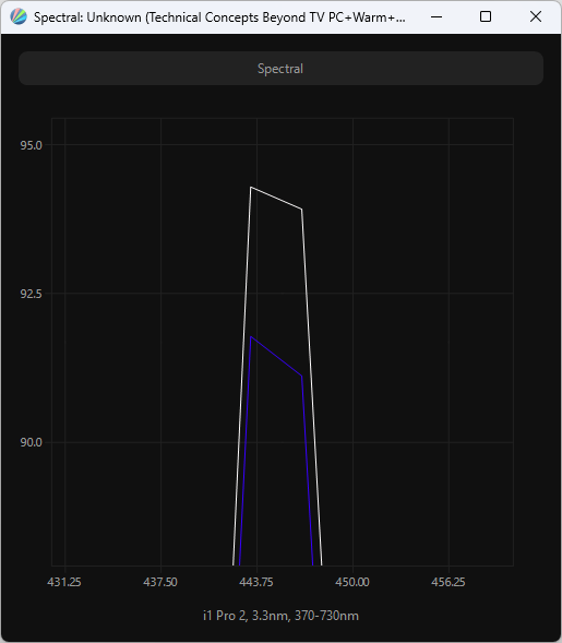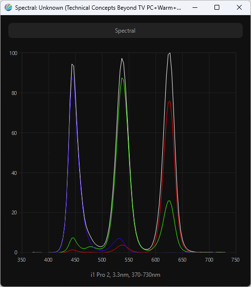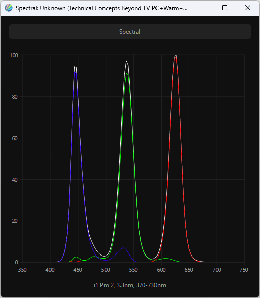 Виден пик синего, приходящийся на 443-444 нм, что не позволяет экрану получить различные современные сертификаты безопасности. Перекрестное подмешивание компонент незначительное. Полученный спектр подтверждает использование в системе подсветки так называемых «квантовых точек», а в условиях применения локальной системы управления яркостью на базе Mini-LED маркетинговое название QD-Mini-LED имеет право на существование. Цветовой охват расширен и приближен не только к кинотеатральному DCI-P3, но и к полиграфическому AdobeRGB.