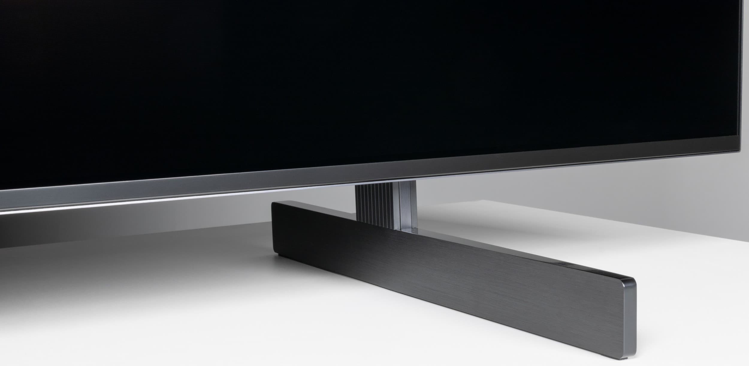 Телевизор отличается ощутимыми габаритами и весом, что абсолютно нормально для модели с такой диагональю и наполнением. При этом толщина корпуса небольшая и не превышает 36 мм в самой толстой части — до рекордов OLED-телевизоров далеко, но для продвинутого ЖК-телевизора это прекрасный показатель.