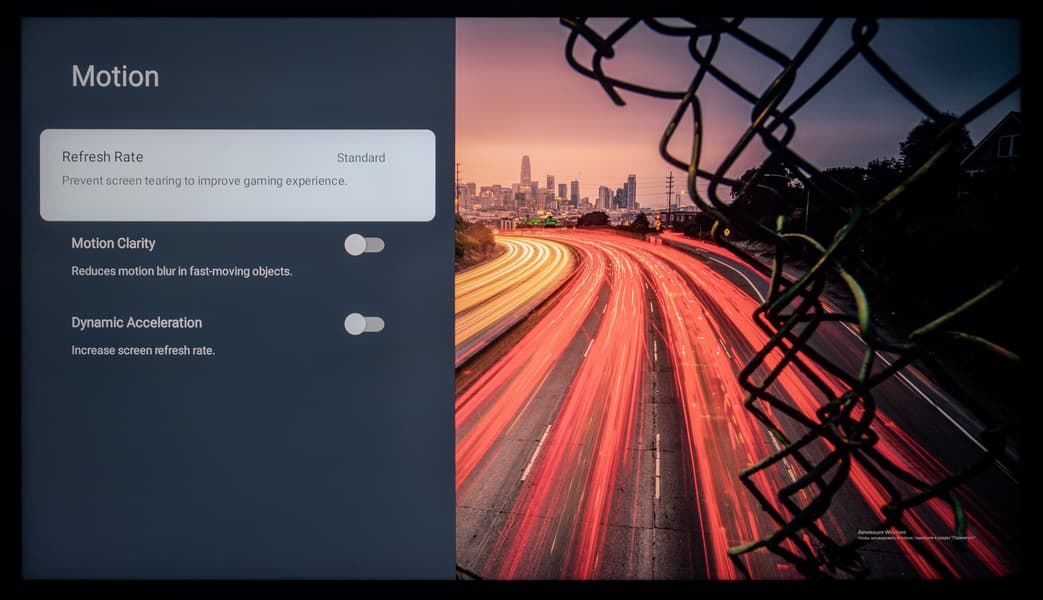 В ходе нашего тестирования фактическое время отклика при переходе черный-белый-черный (BtW-WtB) равно 35,5 мс в среднем по двум режимам (60 и 120 Гц, особой разницы между ними, к нашему удивлению, на данном цветовом переходе не оказалось). Переходы между полутонами (GtG) происходят в среднем за 9,7 мс в режиме 60 Гц и за 8,1 мс при переходе к 120 Гц. Производителем применен слабый разгон матрицы, практически не приводящий к видимым артефактам. Результаты скорости схожи с *VA-моделями за гораздо меньшие деньги, так что если вы рассчитываете на значительную разницу, то рекомендуем обратиться к OLED-телевизорам.