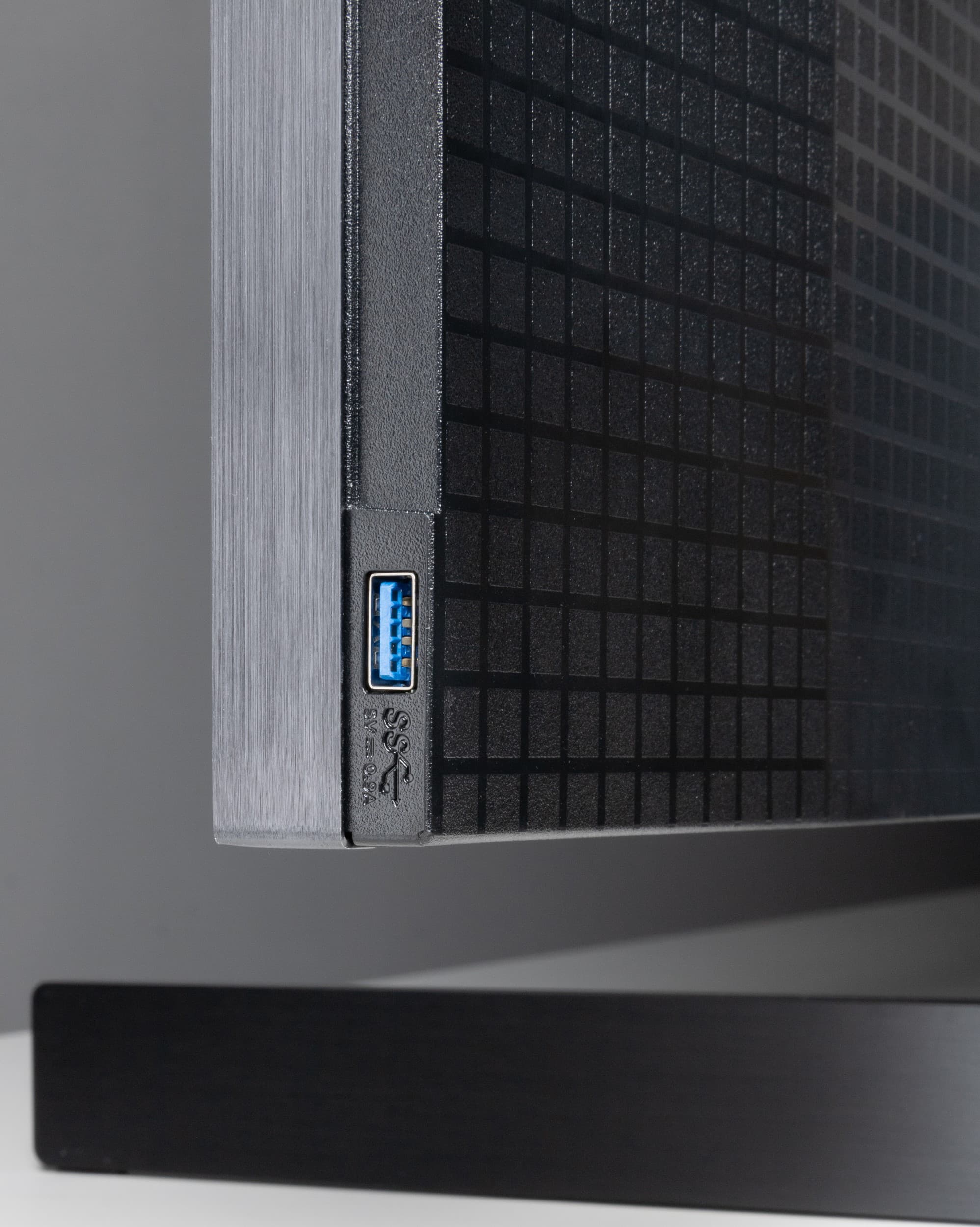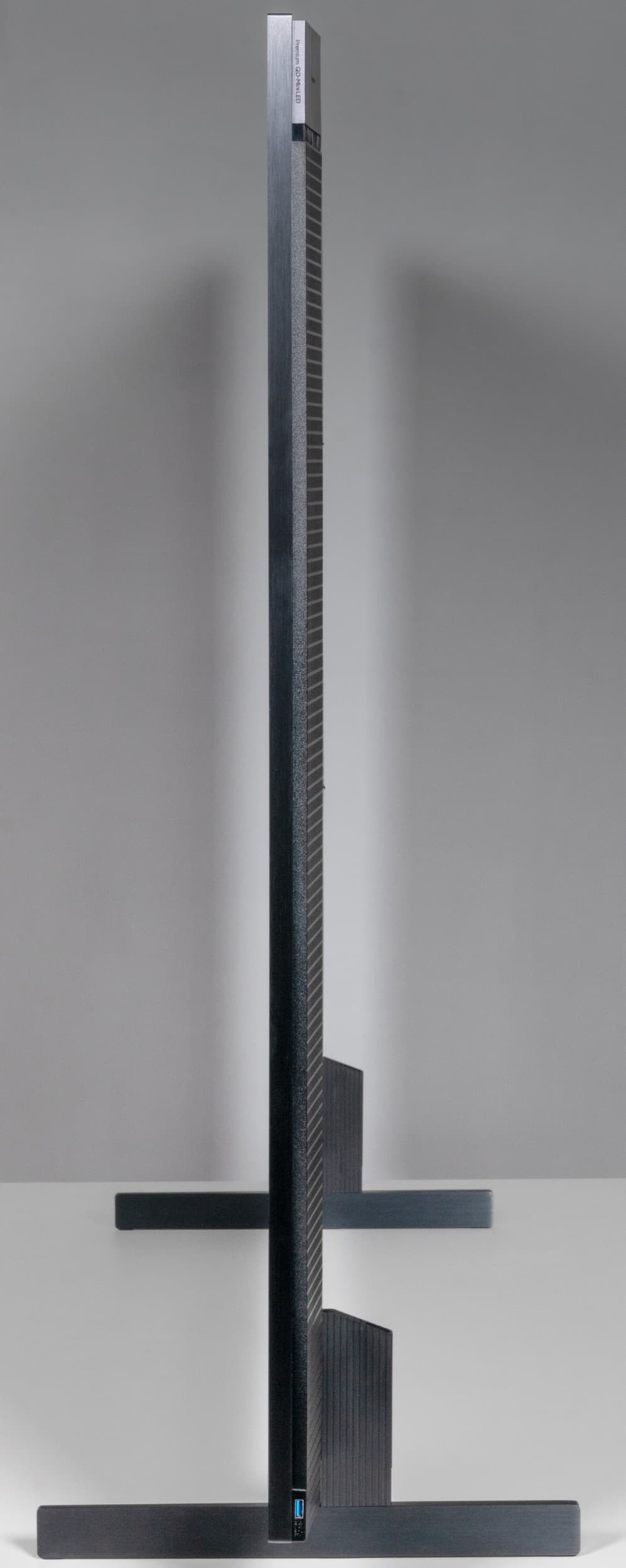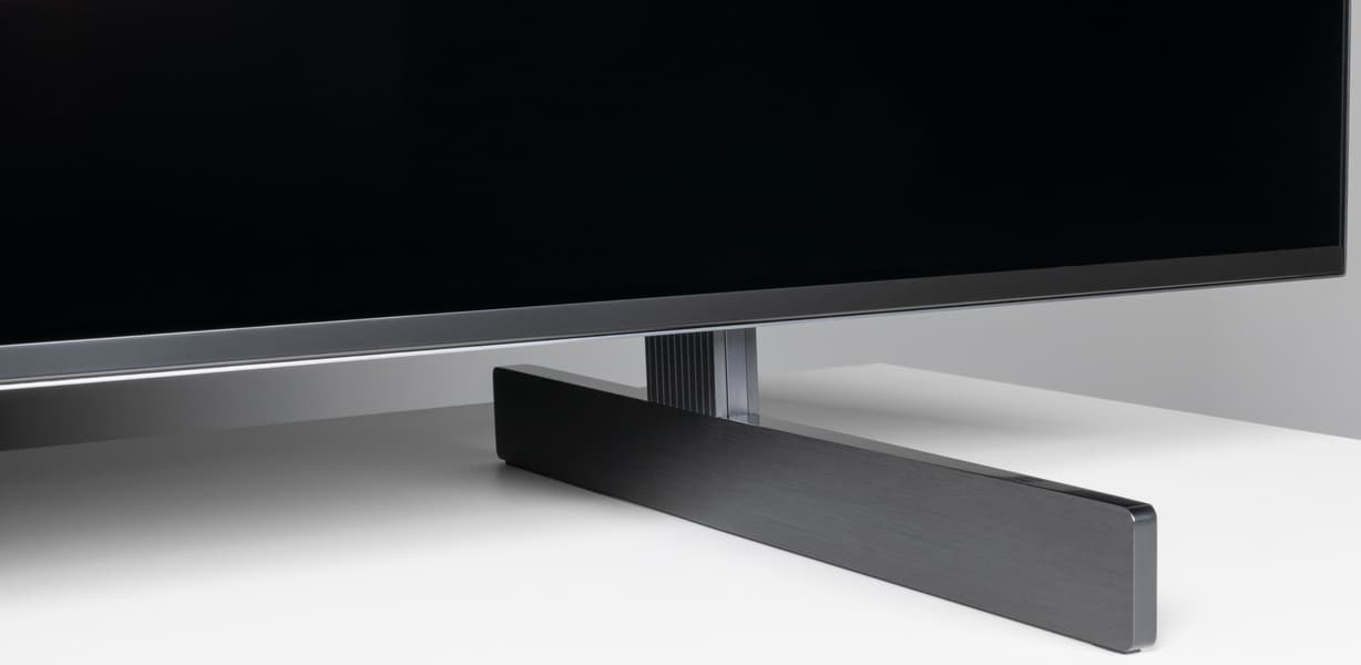 Телевизор выглядит крайне сдержано, но при этом «премиально» и дорого. Дизайнеры поработали над тем, чтобы скрыть всю электронную начинку под один сплошной кожух, без увеличенных в габаритах сегментов, выделенных под интерфейсные разъемы.