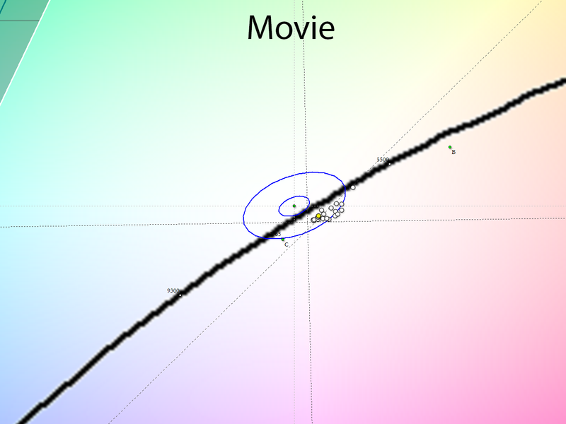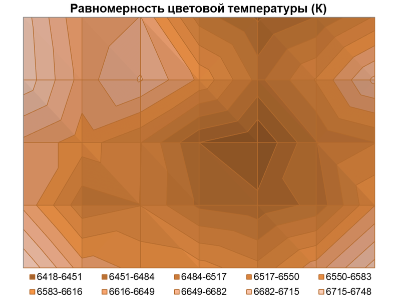 Ничуть не хуже показал себя телевизор в схожих условиях проверки и по стабильности ЦТ по площади экрана: среднее отклонение от центральной точки составило 2,1%, максимальное — 4,6%, а вариация значений по полю экрана не превысила 330 К, что является очень хорошим результатом.