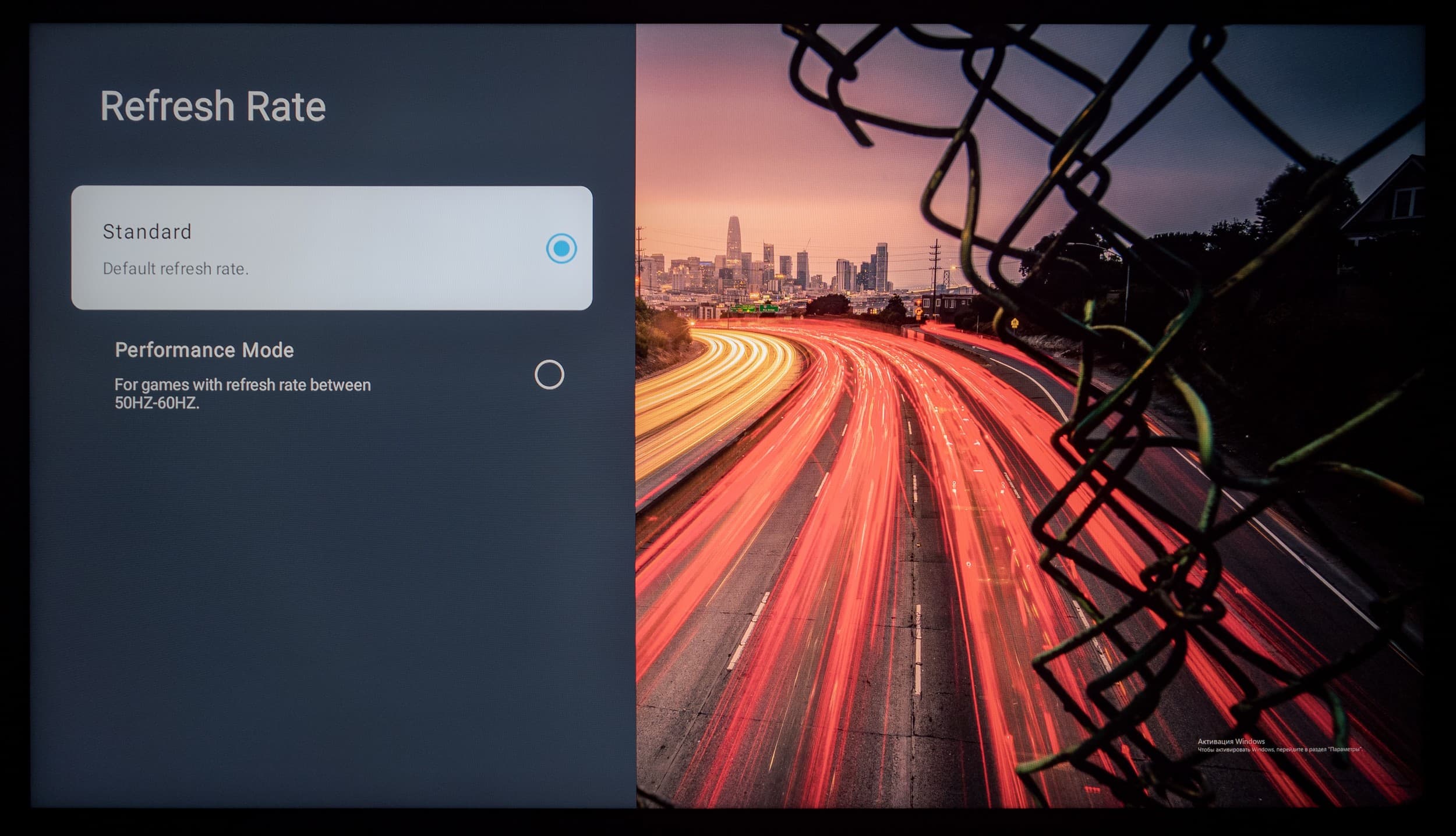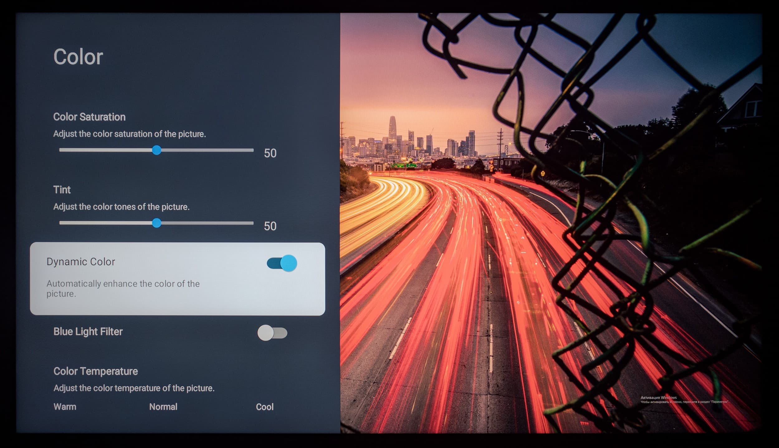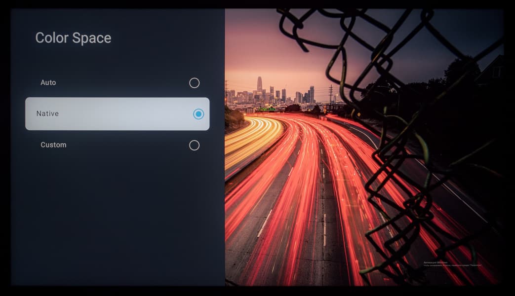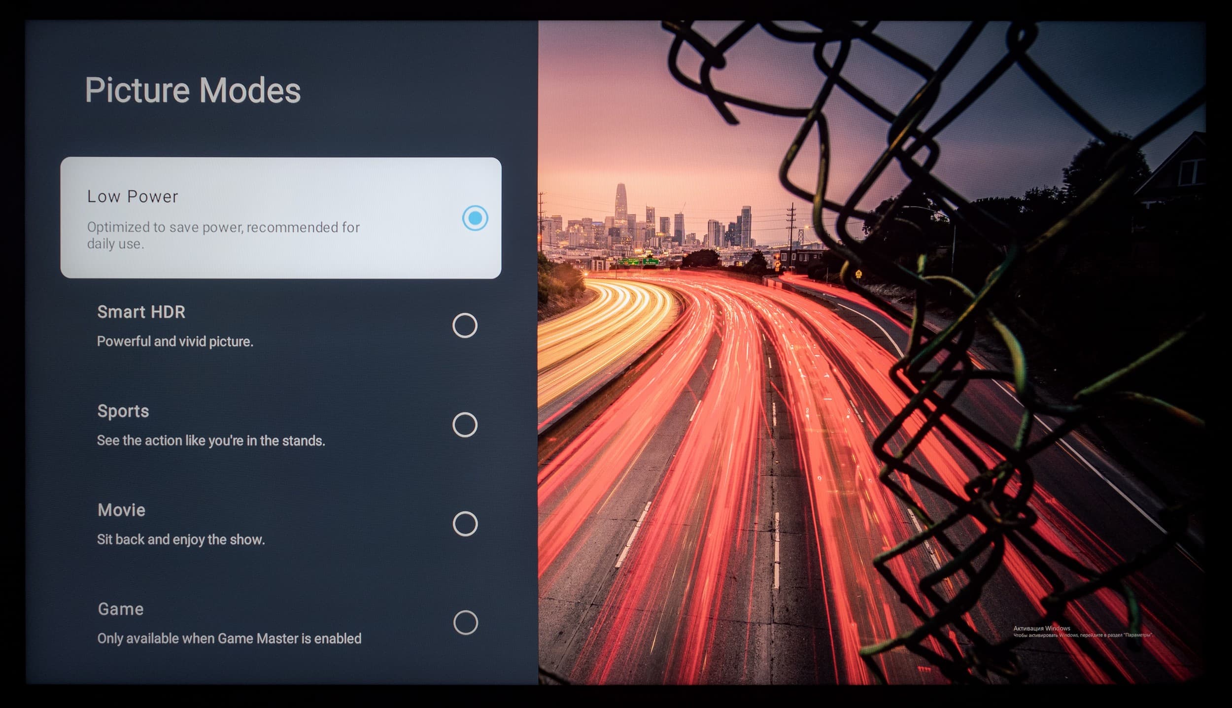 Вместе с тем, протестированный телевизор TCL воспринимает любые форматы HDR (Dolby Vision, HLG, HDR10, HDR10 Adaptive), но информационное окно в первые 5 секунд после старта видео показывает только варианты HDR10 и HLG. Возможность выбора предустановленных режимов изображения сохраняется, но их названия и подход к изменению картинки при этом не меняются — всё то же самое, что и для SDR.